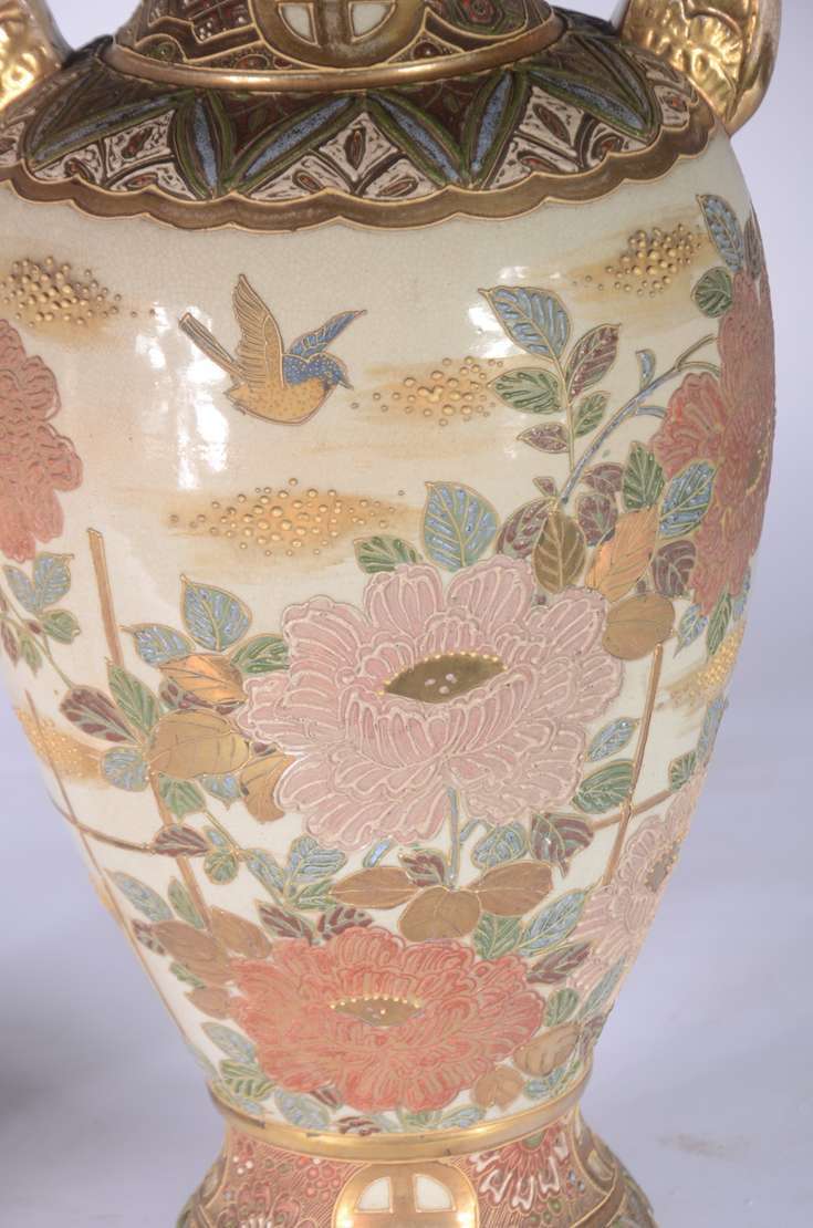 Par de antigos potiches de porcelana chinesa decorados com galhos, folhagens e pássaros em policromia, tampas e bases...