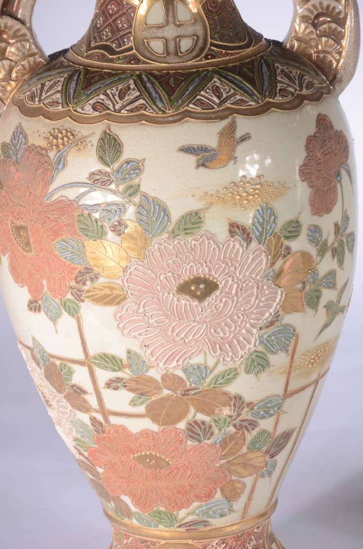Vaso de porcelana oriental decorado com dragões, cães de Fó, pássaros e vegetação em policromia. Alças com cabeças de...