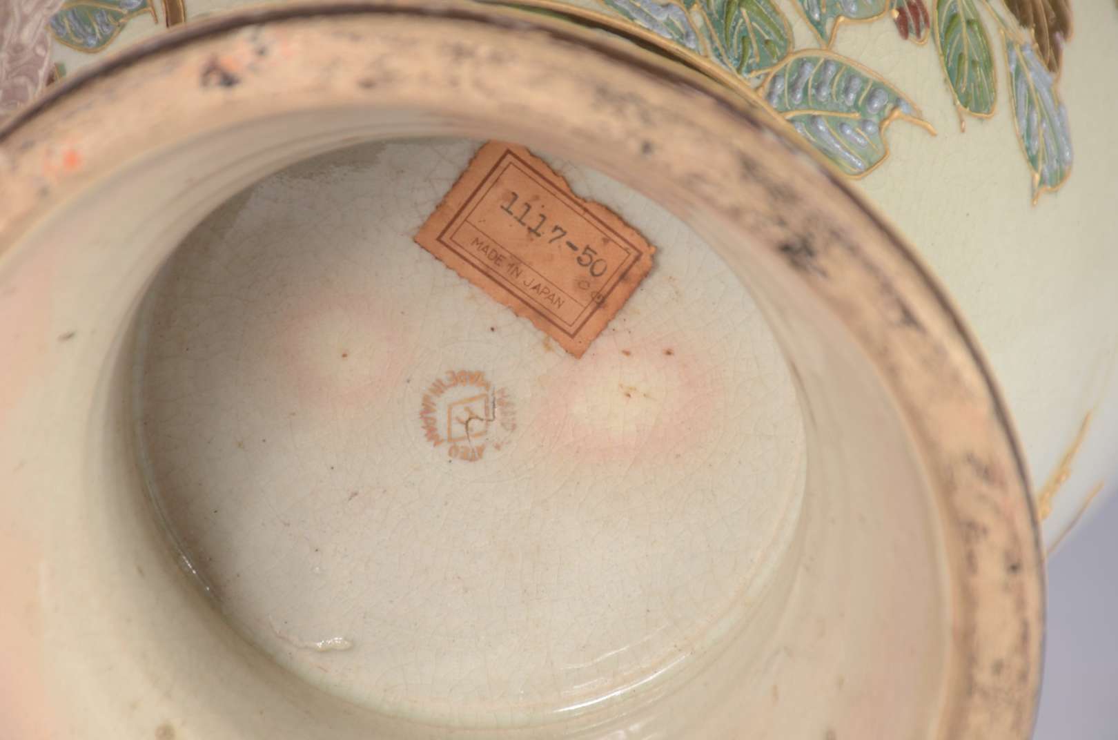 Vaso de faiança oriental decorado com guerreiros em policromia, base de madeira.