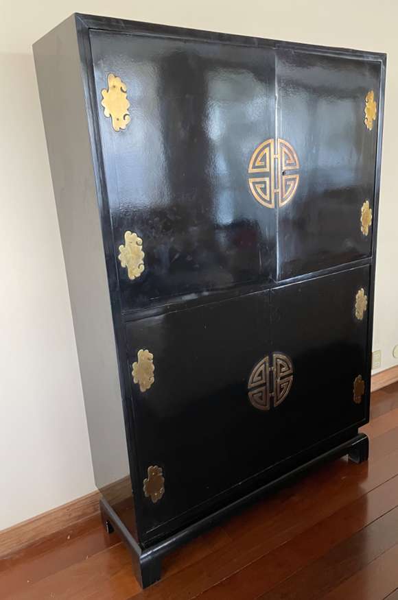 Móvel oriental de lacca preta, duas portas na parte superior e duas na inferior, prateleiras internas. Fundo do lado ...