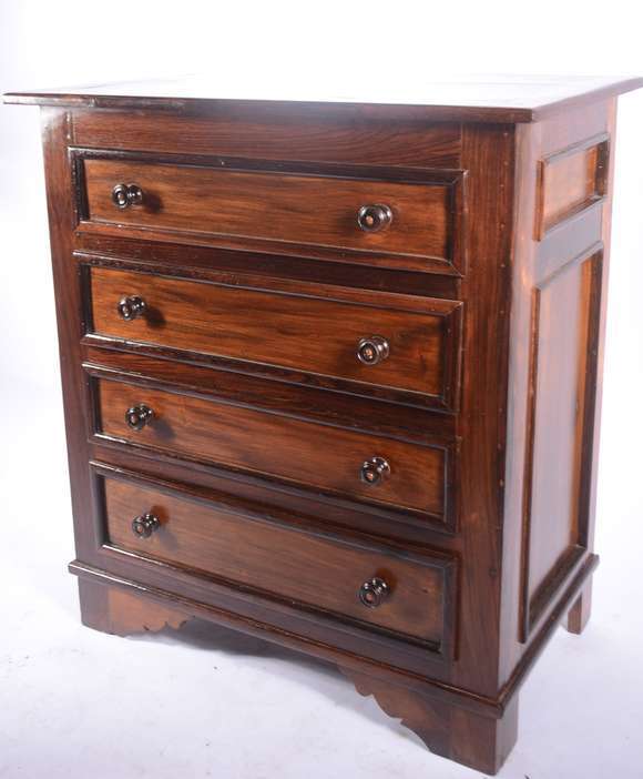 Cômoda de madeira nobre, quatro gavetas emolduradas e puxadores redondos.