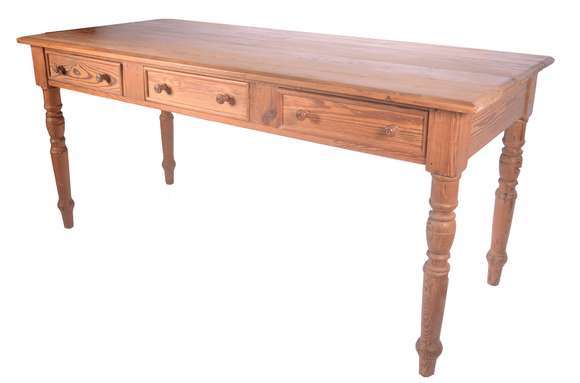 Mesa de escritório de pinho de riga com 3 gavetas, tampo retangular apoiado em quatro pernas torneadas.