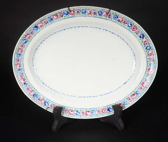 Travessa oval de porcelana oriental, borda com flores policromadas. Pequeno lascado na borda.