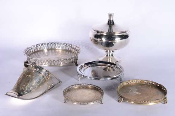 Seis peças diversas de metal prateado, sendo: sapata floreira; bomboniere; e 4 salvas diversas. Desgastes.