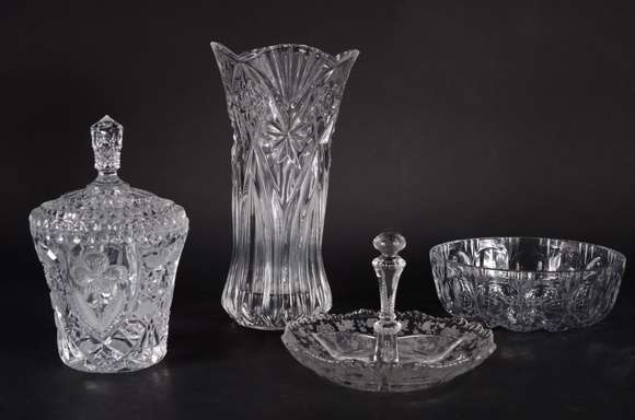 Quatro peças diversas de cristal/vidro, sendo: bowl, vaso, bomboniere e porta petiscos.