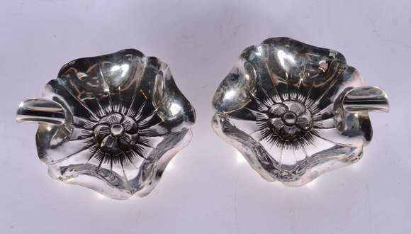 Par de cinzeiros individuais de prata na forma de flor, contraste 833 mls. Peso da prata: 110 g. (Por motivos de segu...