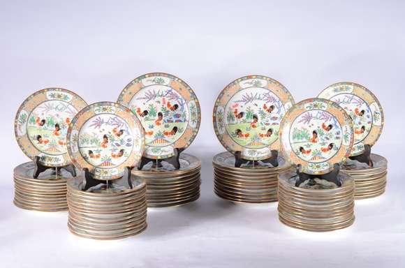 Serviço de jantar de porcelana chinesa, decorados com galos em policromia, composto de: 24 pratos rasos, 24 pratos pa...
