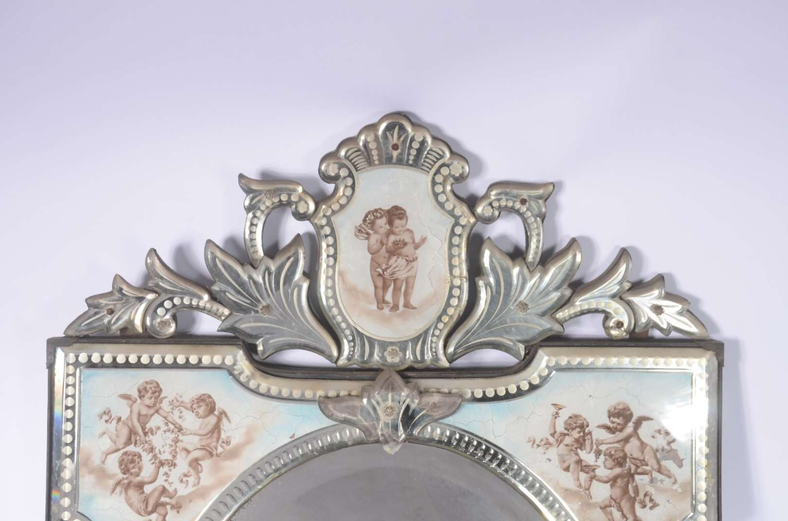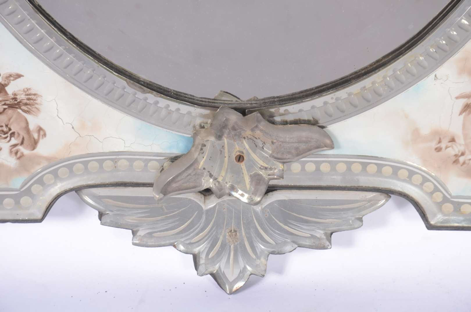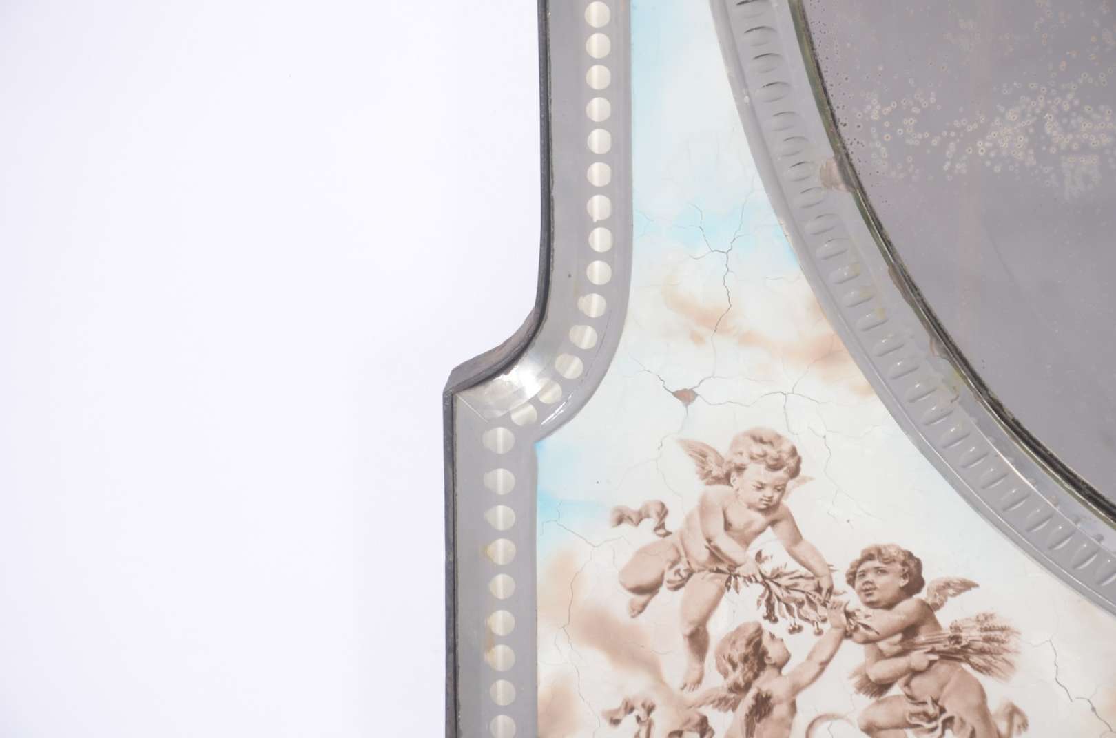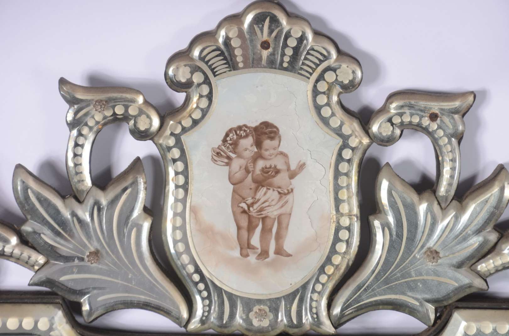 Medalhão de metal prateado com concheados em relevo (desgastes).