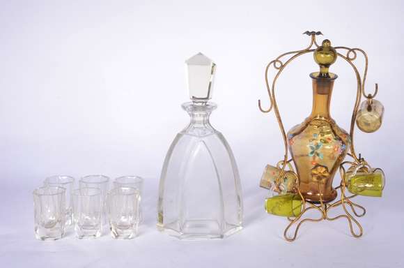 Duas licoreiras, sendo: uma com 6 copinhos facetados e outra com guarnição de metal com 5 copinhos (2 diferentes).