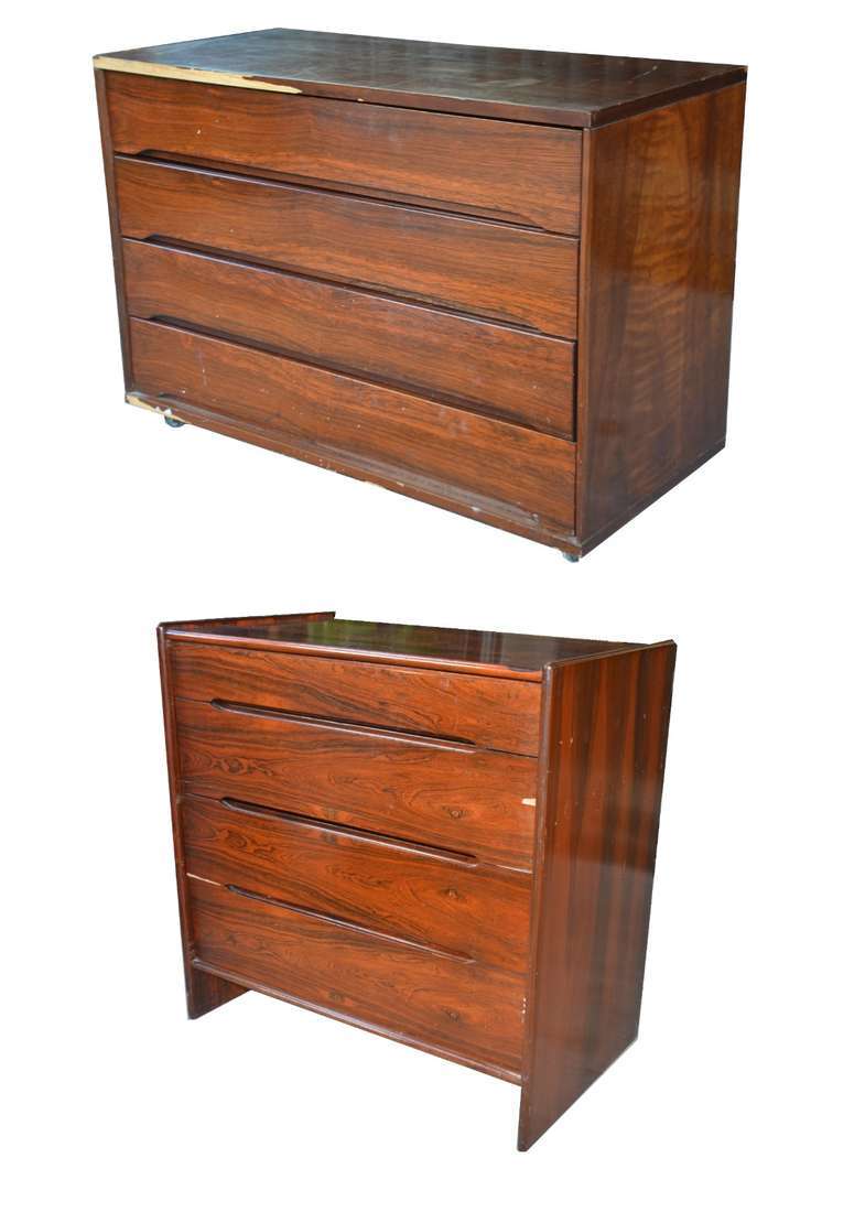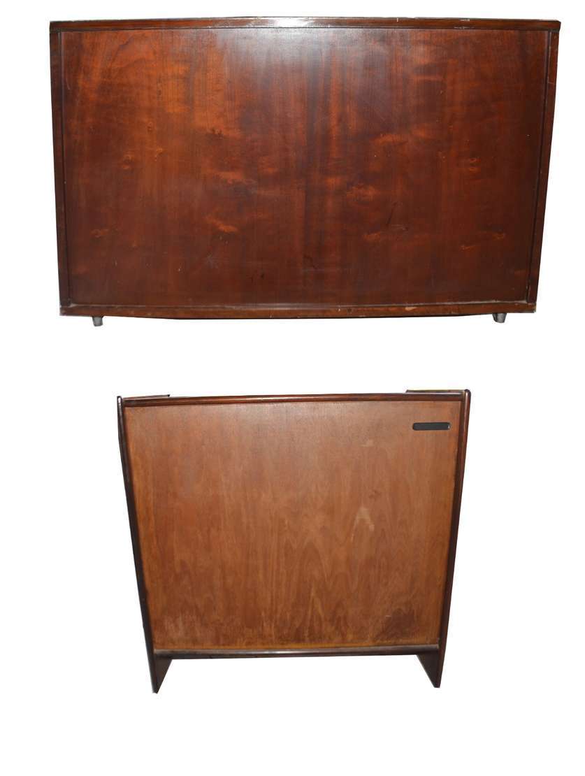 Duas mesinhas laterais de madeira nobre, uma delas com três gavetas e outra com uma gaveta e porta, tampos de mármore...