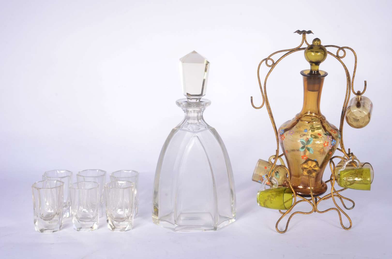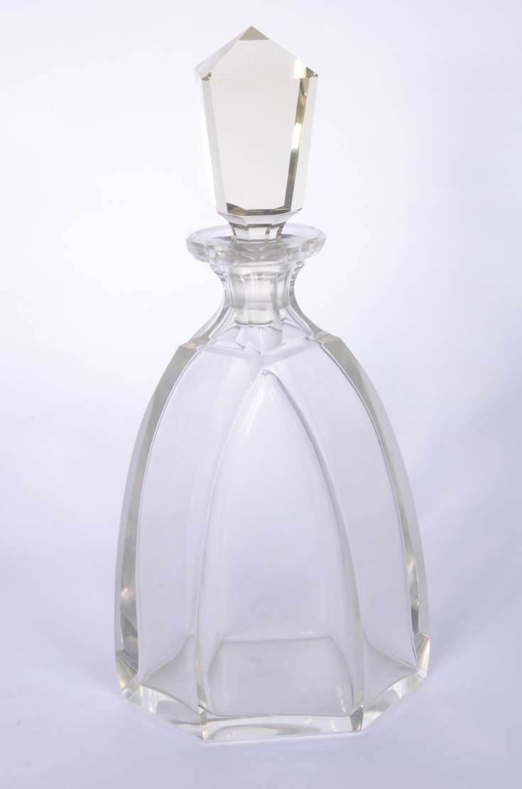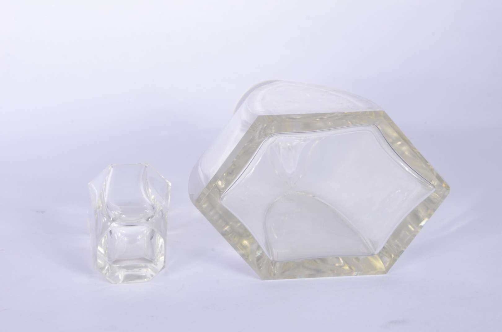 Duas fruteiras de cristal lapidado, sendo uma baixa no feitio quadrangular e a outra de pé alto decorada com figuras ...