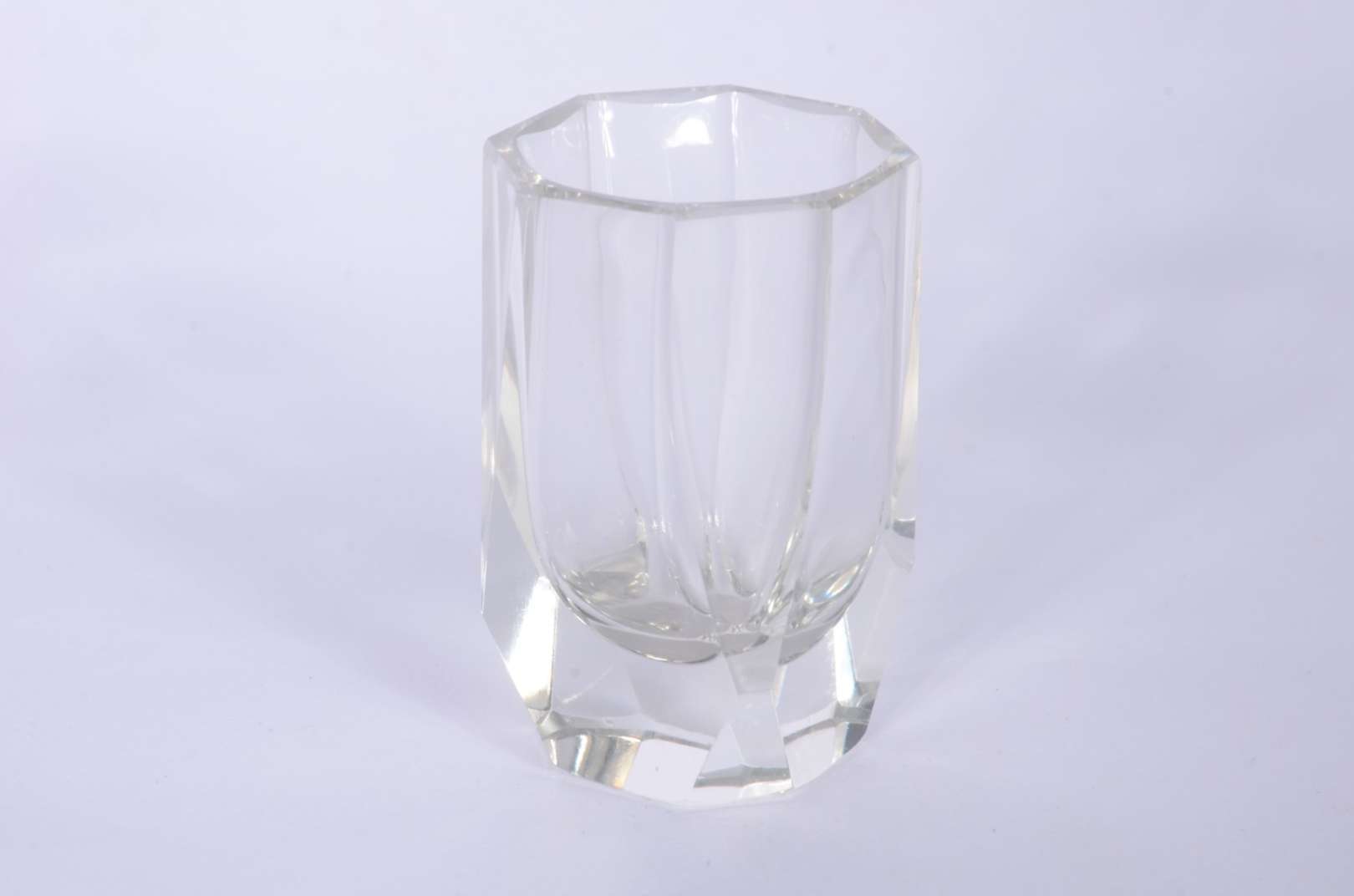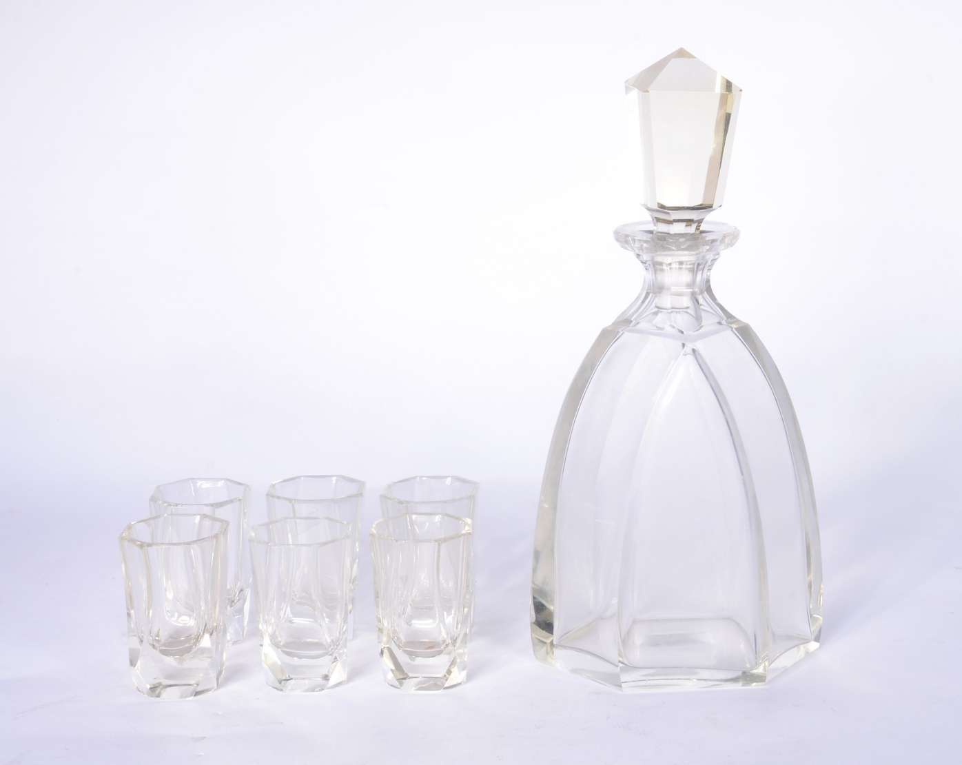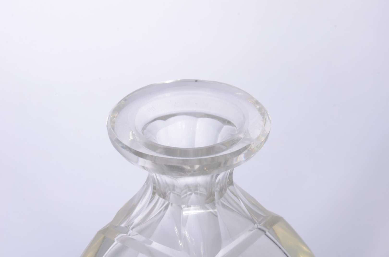 Duas fruteiras de cristal lapidado, sendo uma baixa no feitio quadrangular e a outra de pé alto decorada com figuras ...