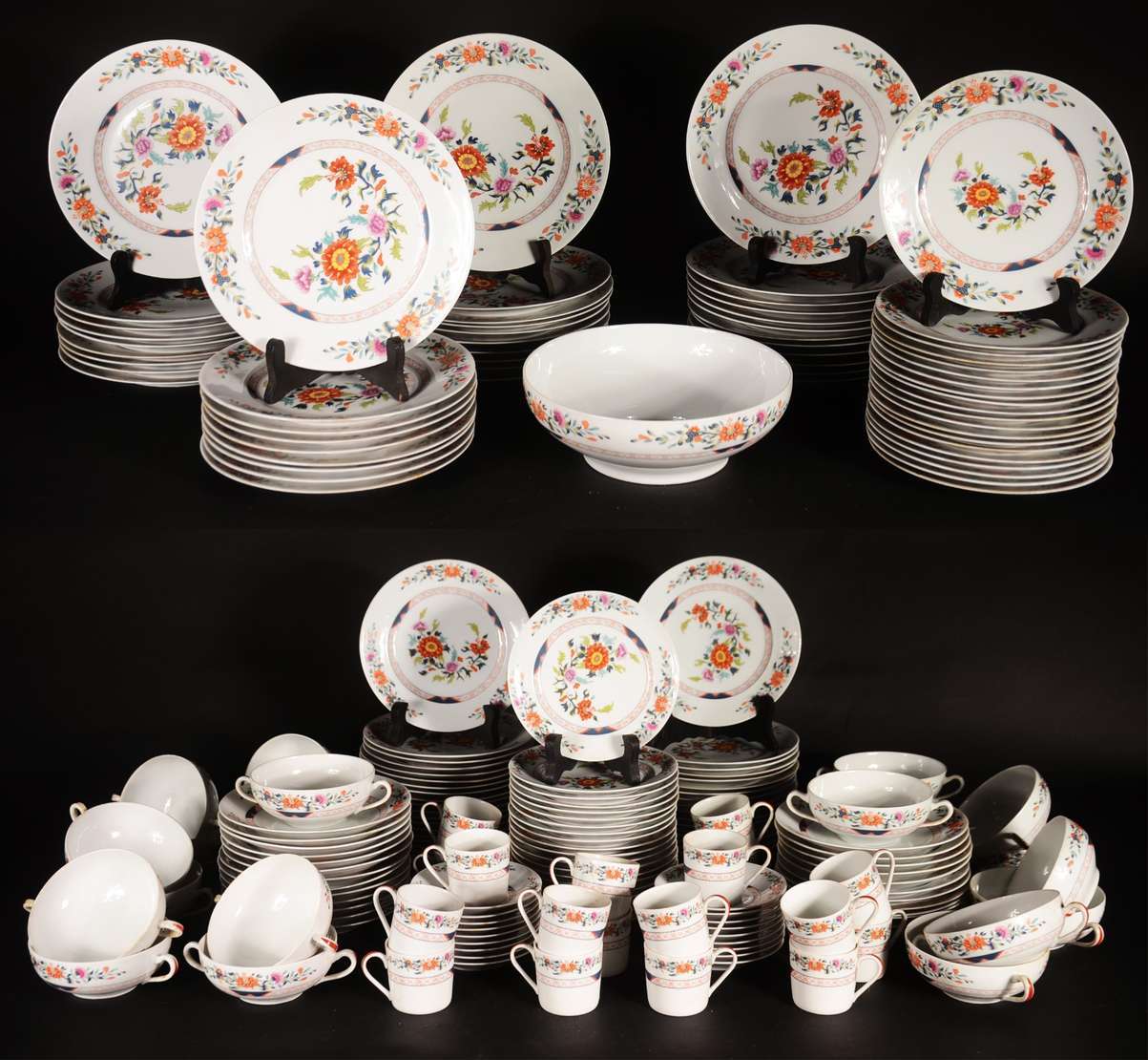 Serviço de jantar de porcelana chinesa, decorados com galos em policromia, composto de: 24 pratos rasos, 24 pratos pa...