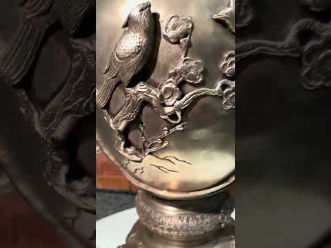 Par de vasos japoneses de faiança Satzuma, decorados com flores e pássaros em policromia e realces dourados. Um deles...