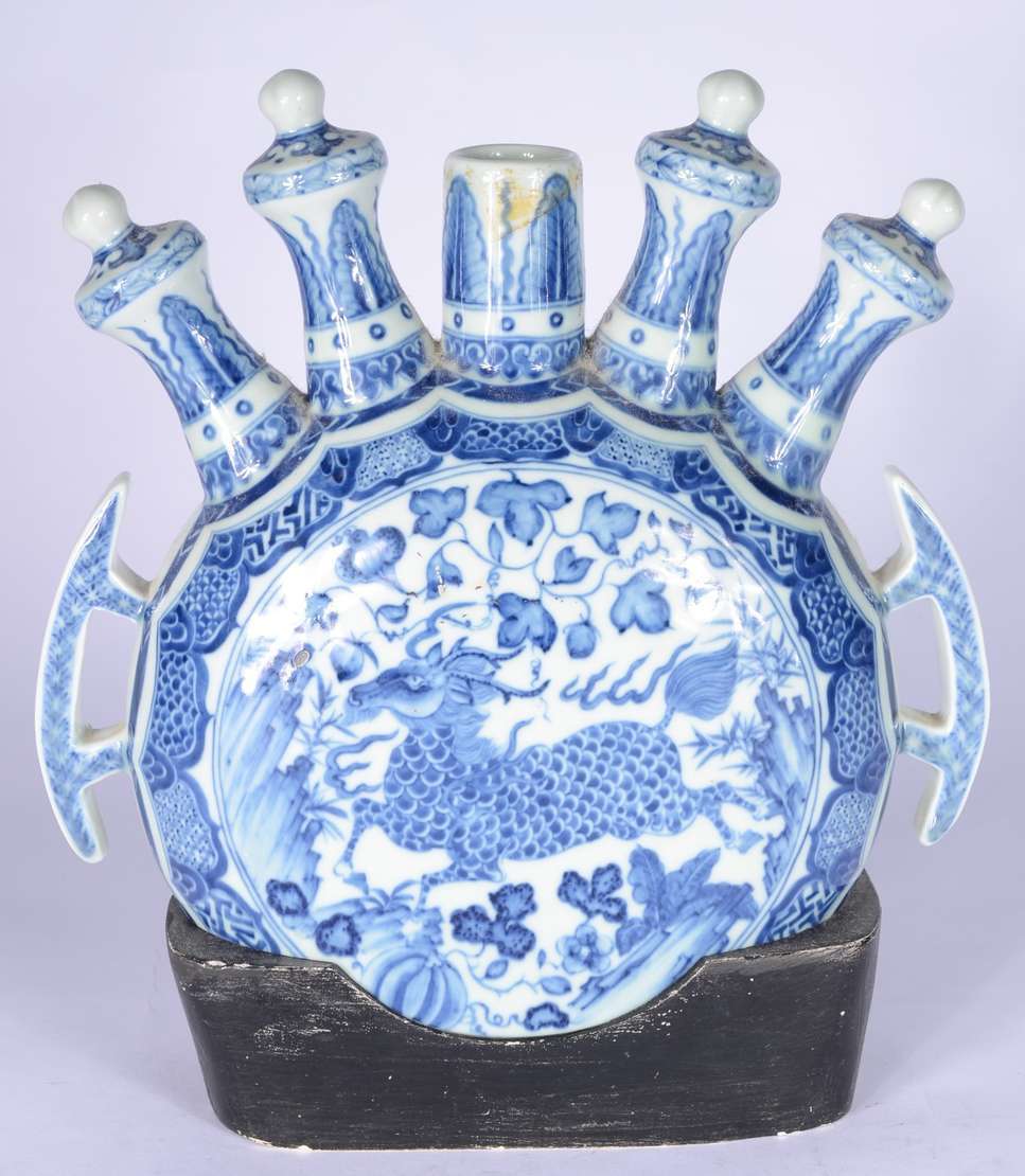 Coluna oriental de madeira com detalhes entalhados e vazados e aplicações de madrepérola. Pés de garra sobre bola.
