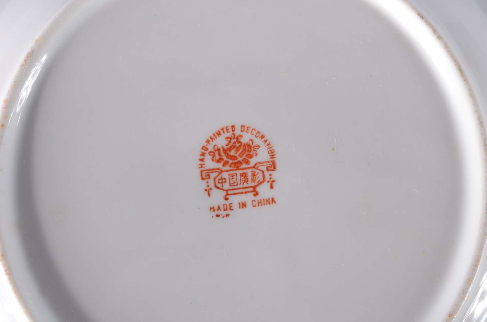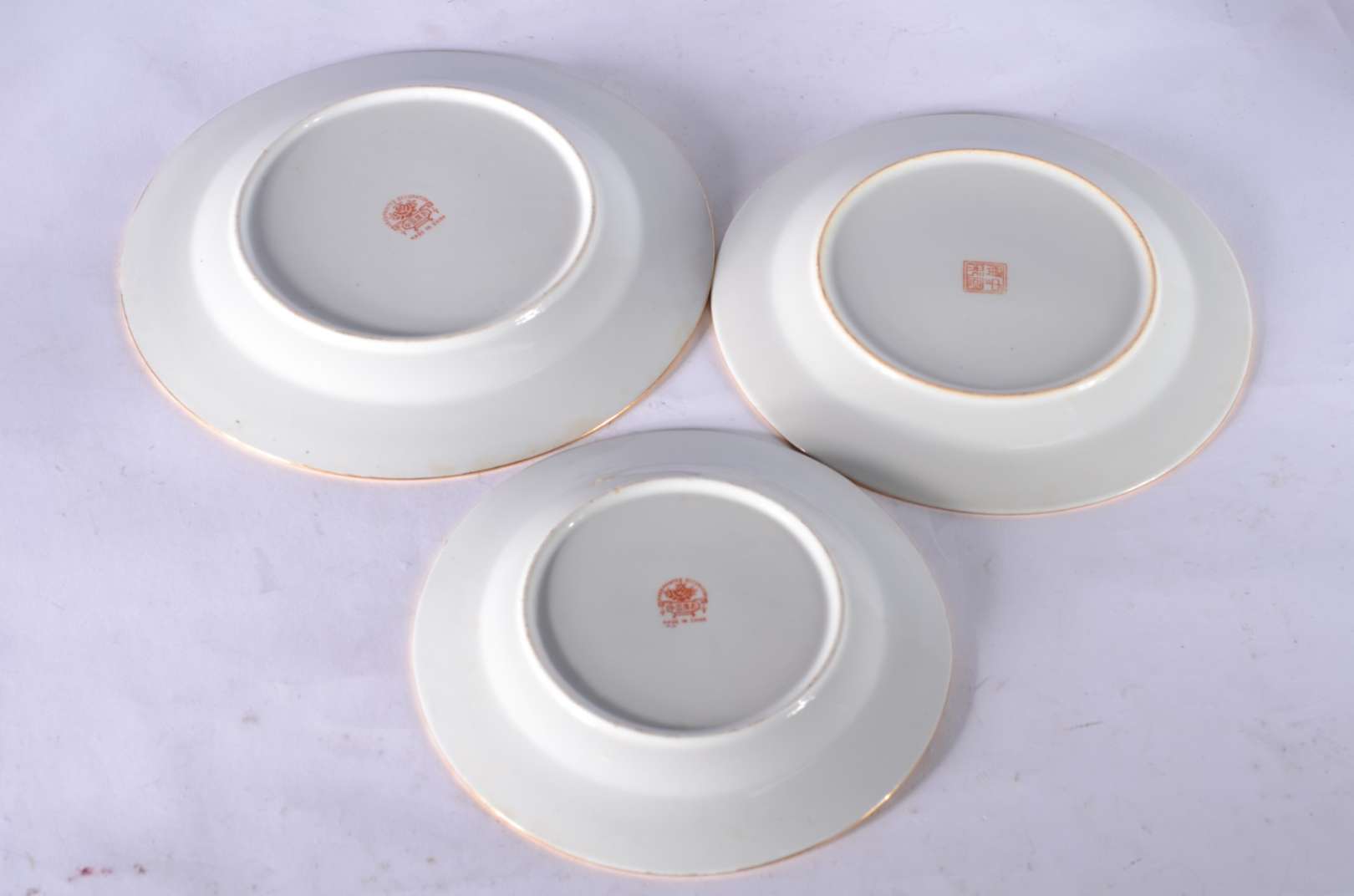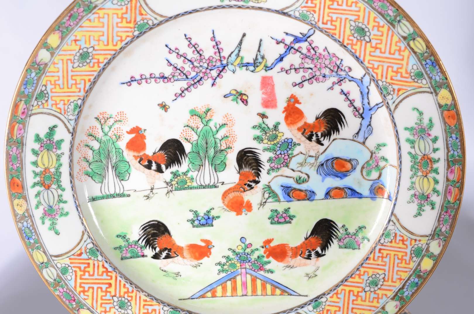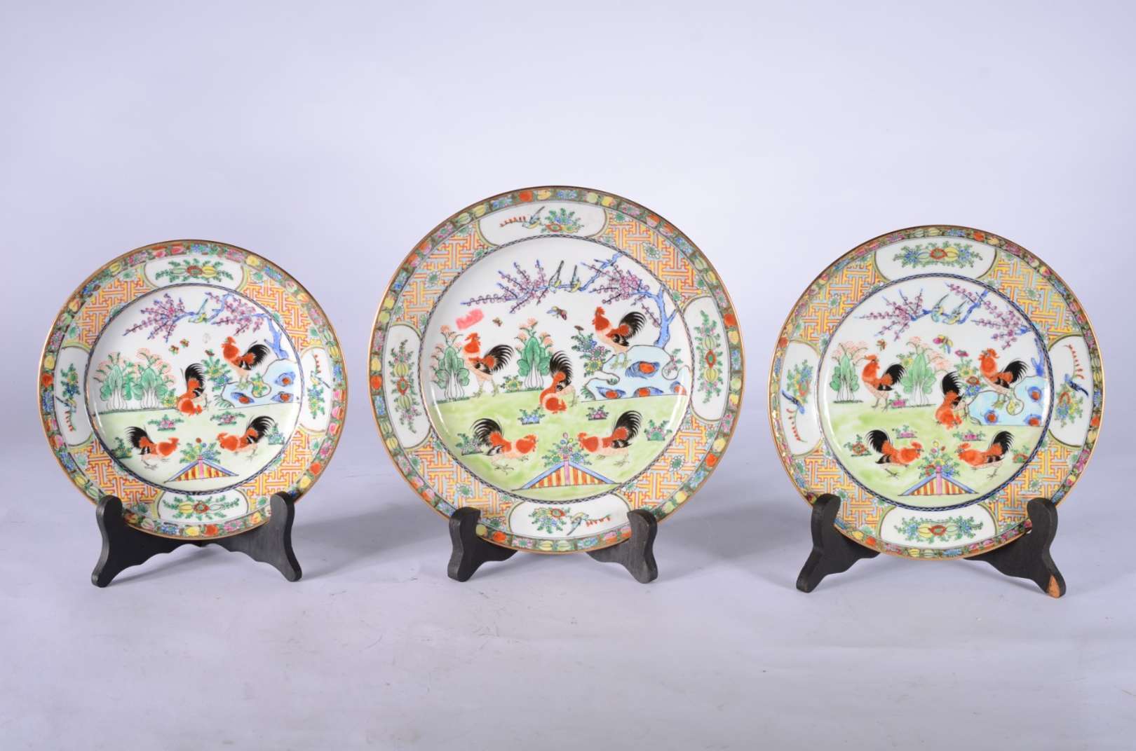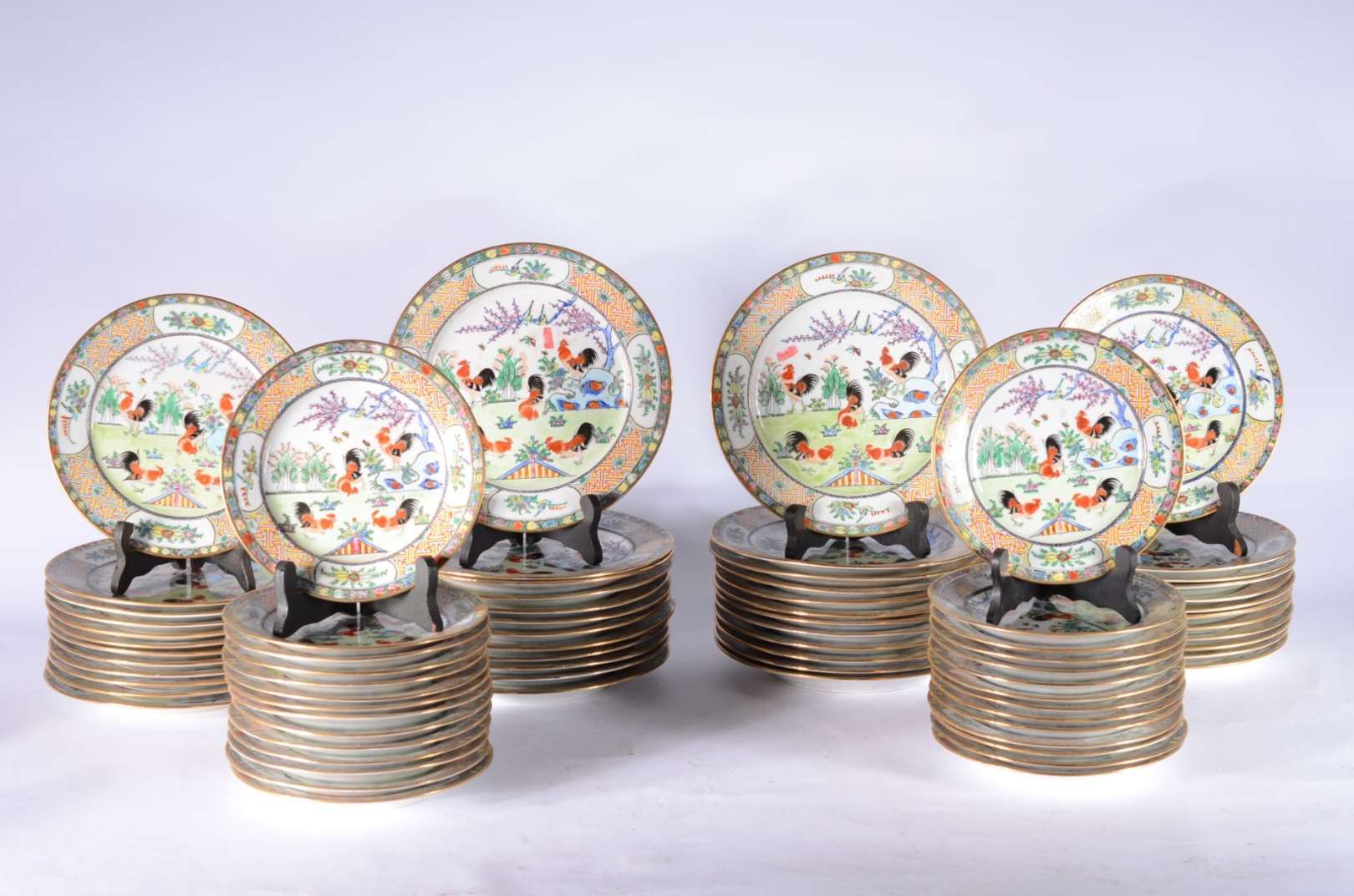 Serviço de jantar de porcelana chinesa, decorados com galos em policromia, composto de: 24 pratos rasos, 24 pratos para entrada e 28 pratos de sobremesa. Total: 76 peças.