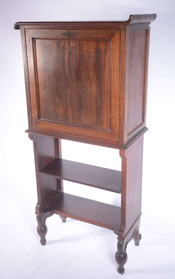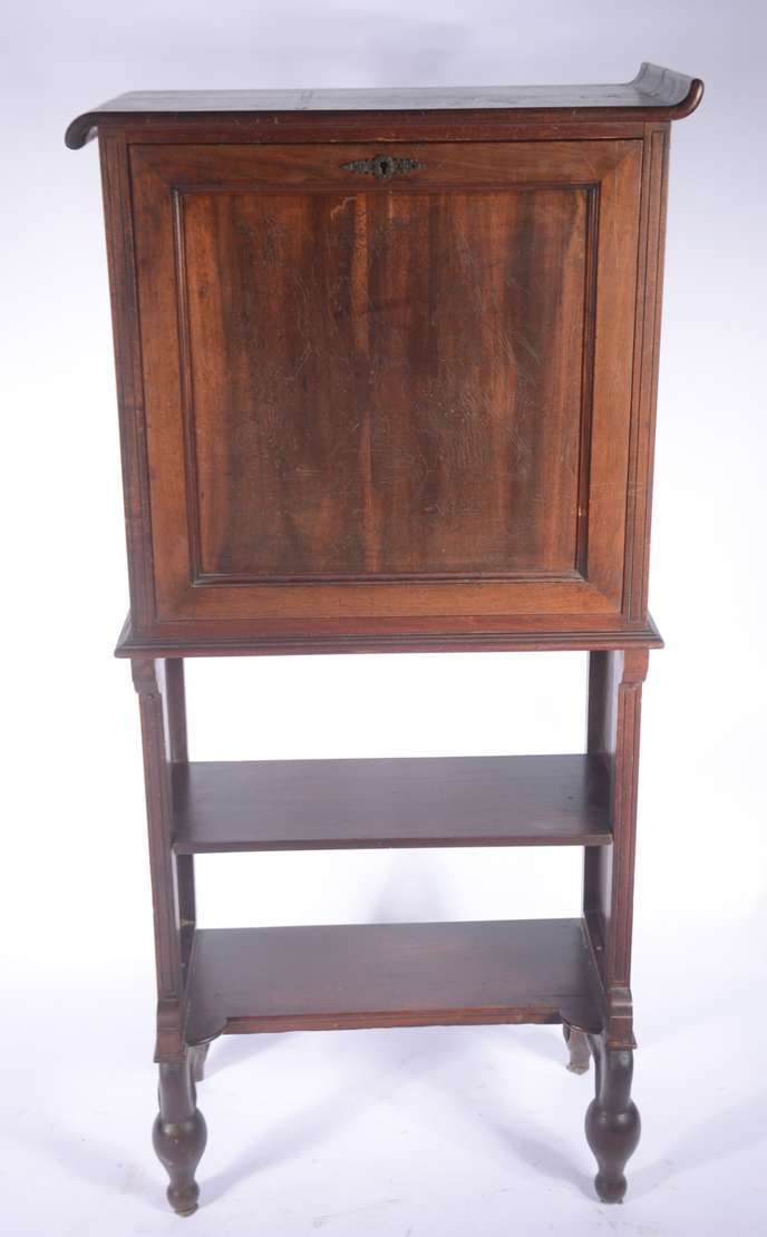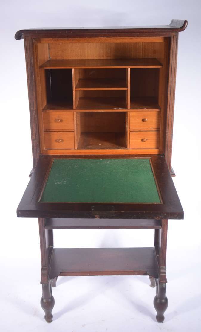 Mesa/aparador de madeira nobre, tampo dobrável, saia entalhada. Base em coluna balaústre canelada terminando em 4 per...