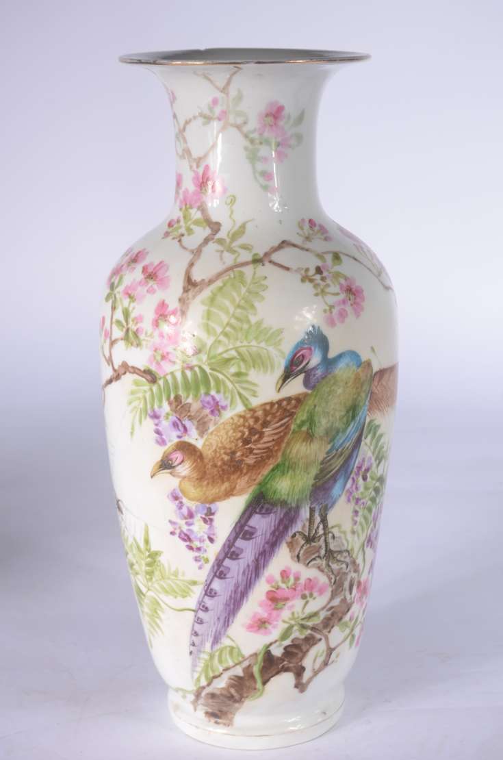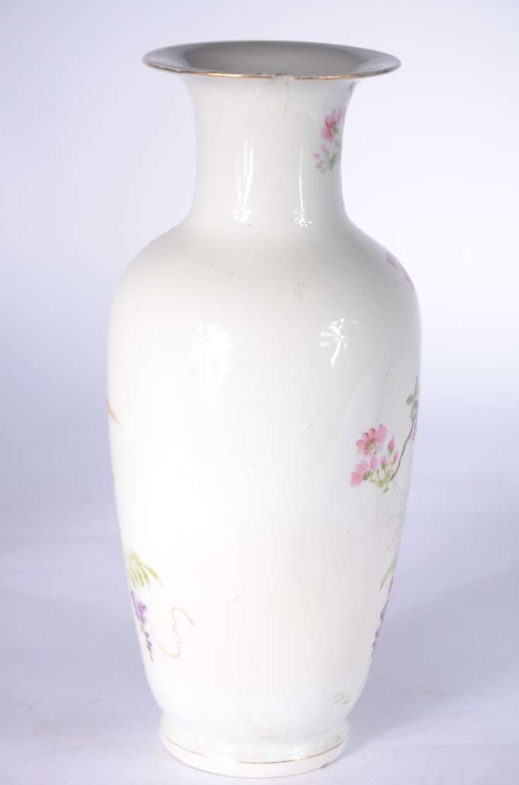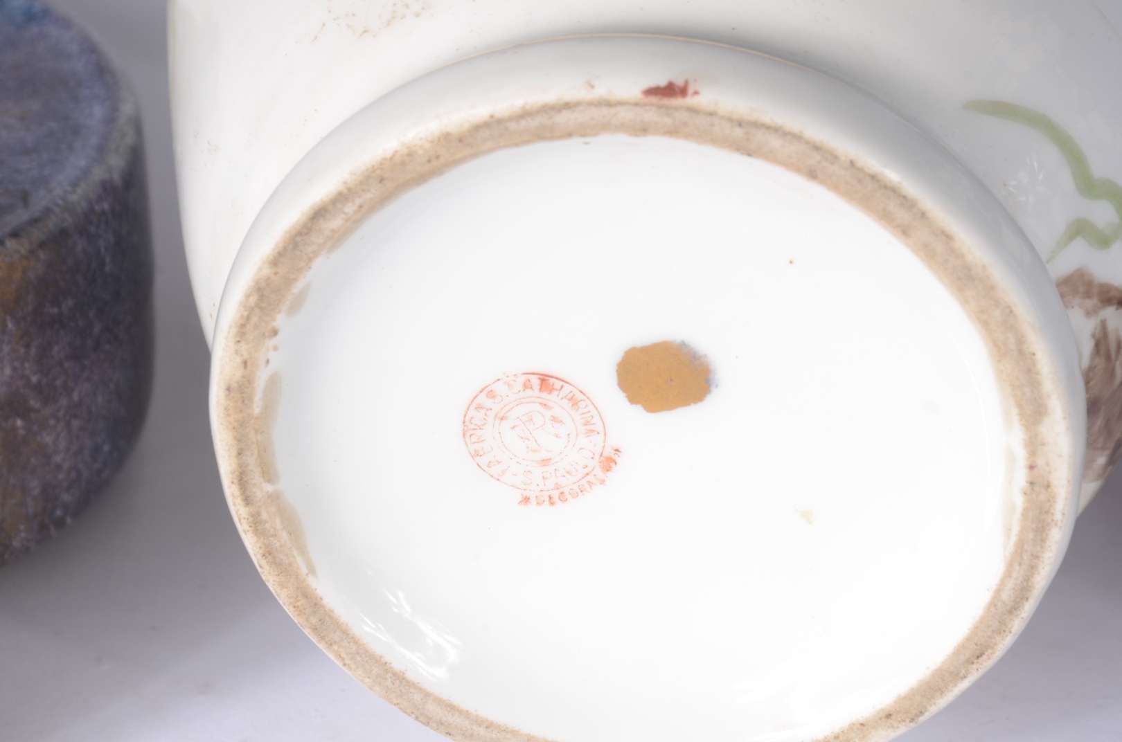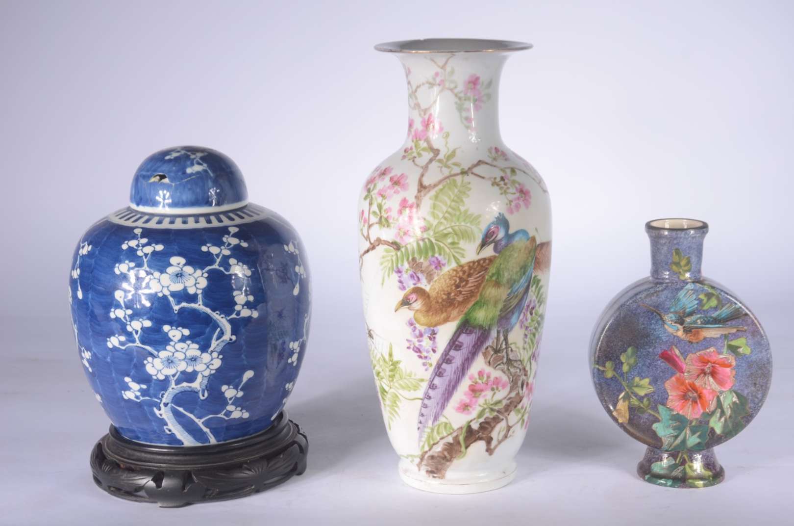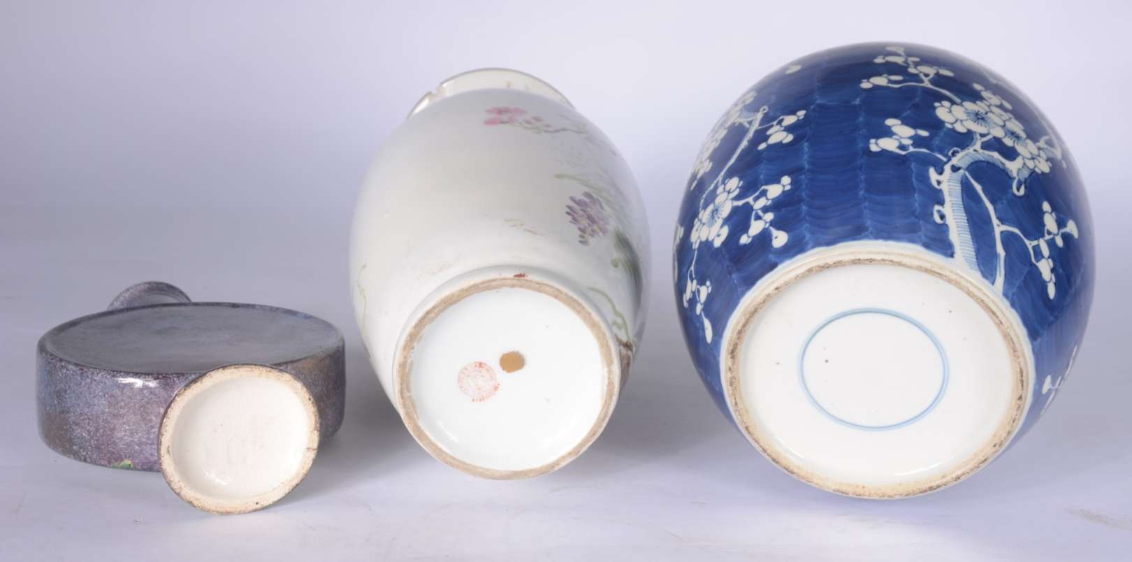 Três peças de porcelana ao gosto oriental, sendo potiche com base de madeira (tampa quebrada) e 2 vasos, sendo um com fundo branco e flores em policromia (borda lascada).