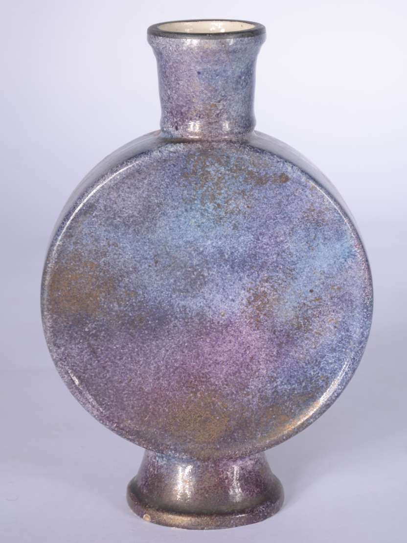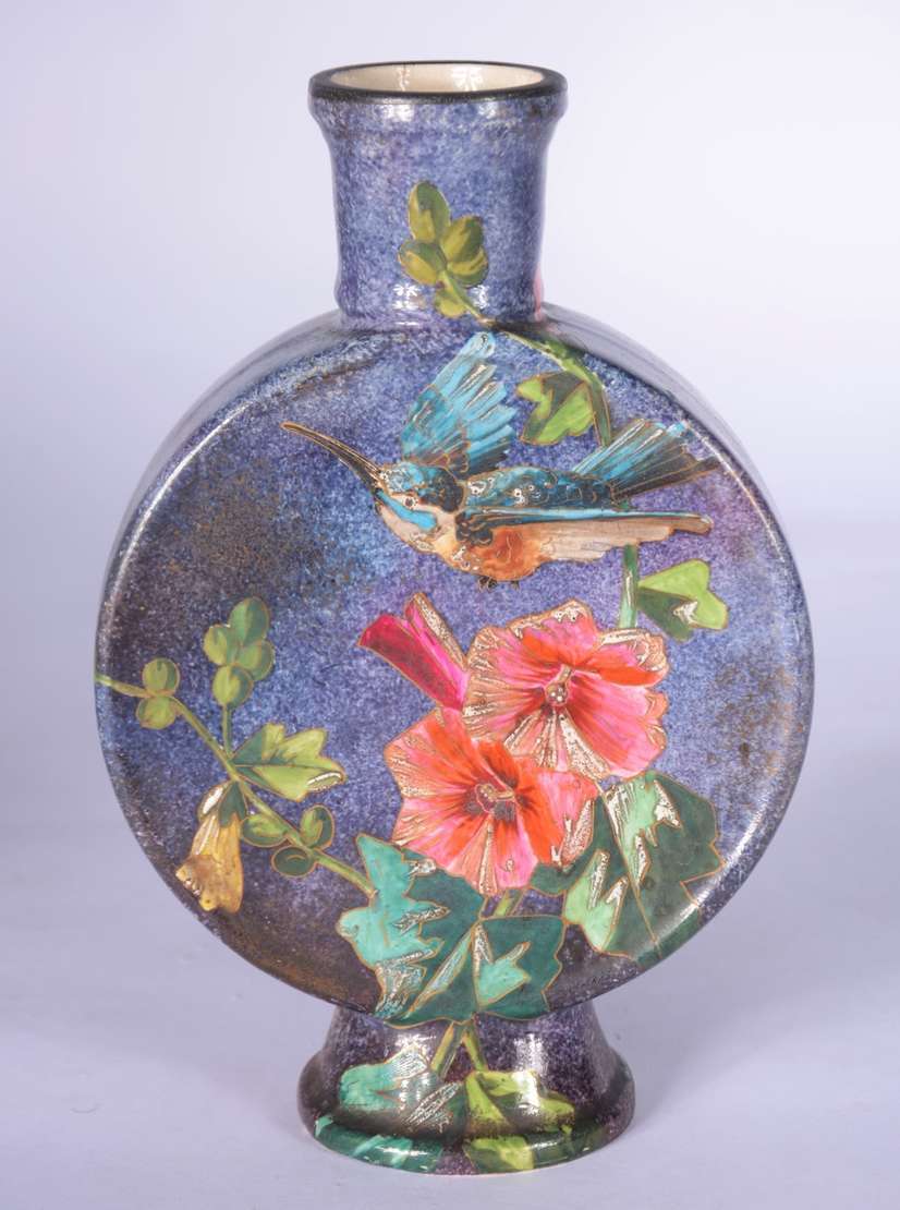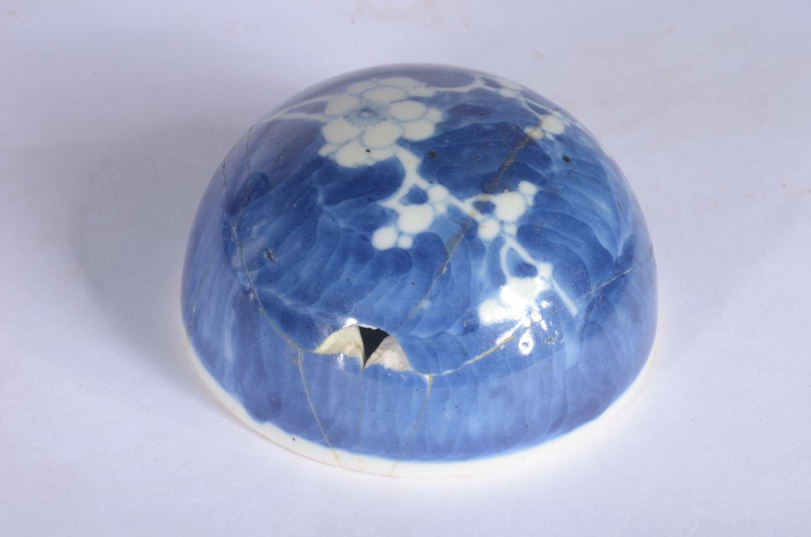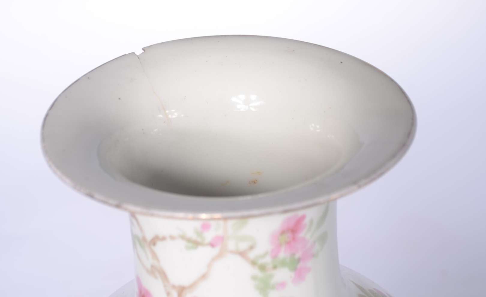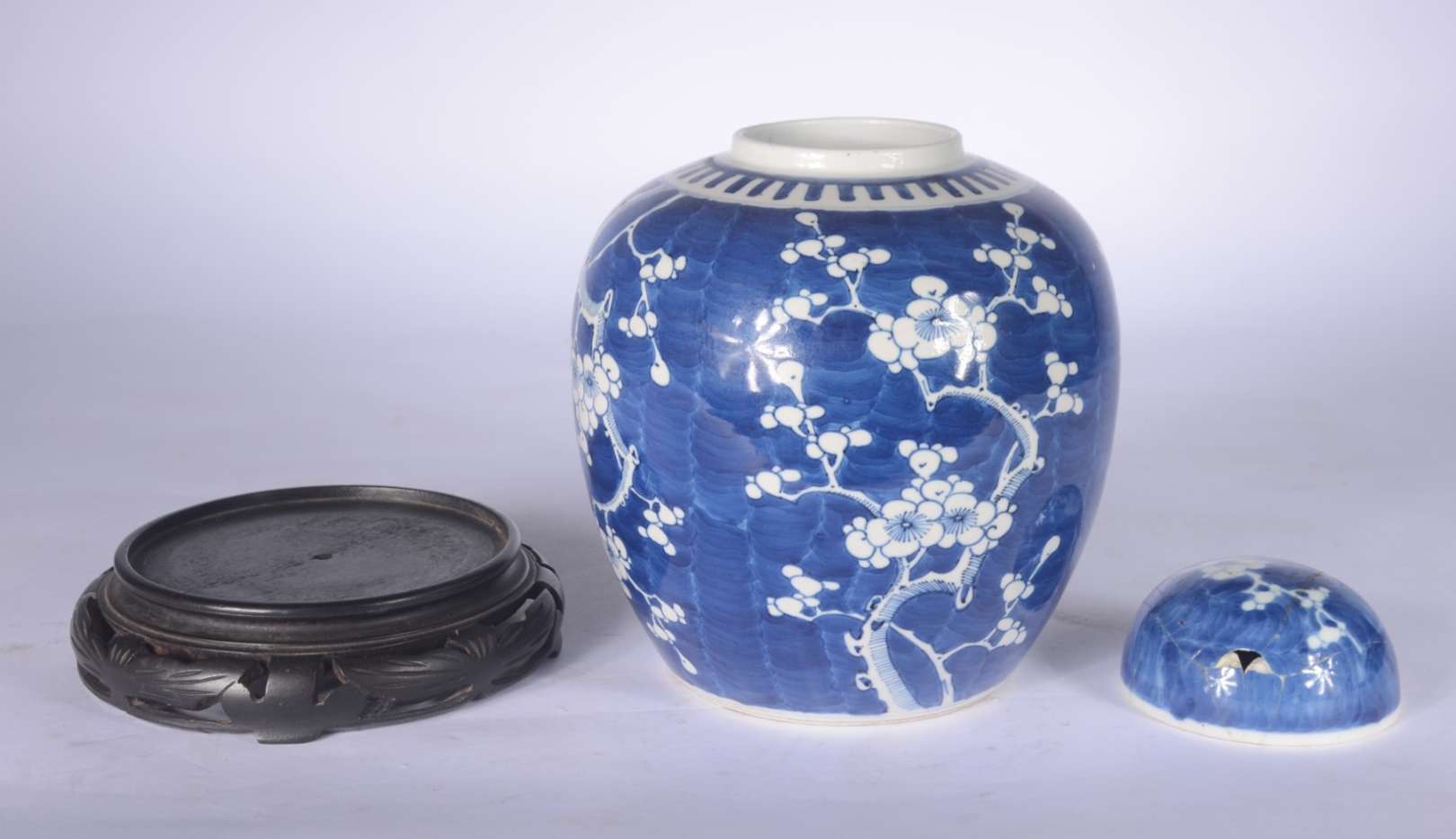 Três peças de porcelana ao gosto oriental, sendo potiche com base de madeira (tampa quebrada) e 2 vasos, sendo um com fundo branco e flores em policromia (borda lascada).