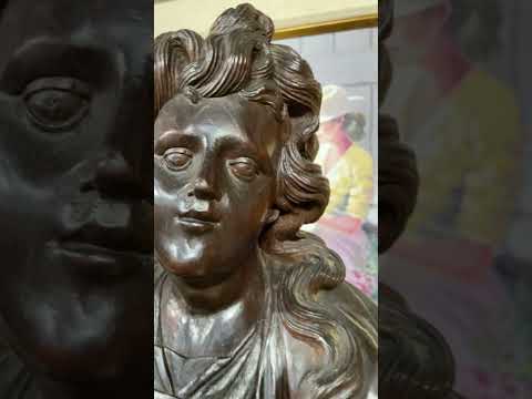 Escultura representando figura feminina com véu e manto de bronze e rosto de marfim. Faltando as mãos.