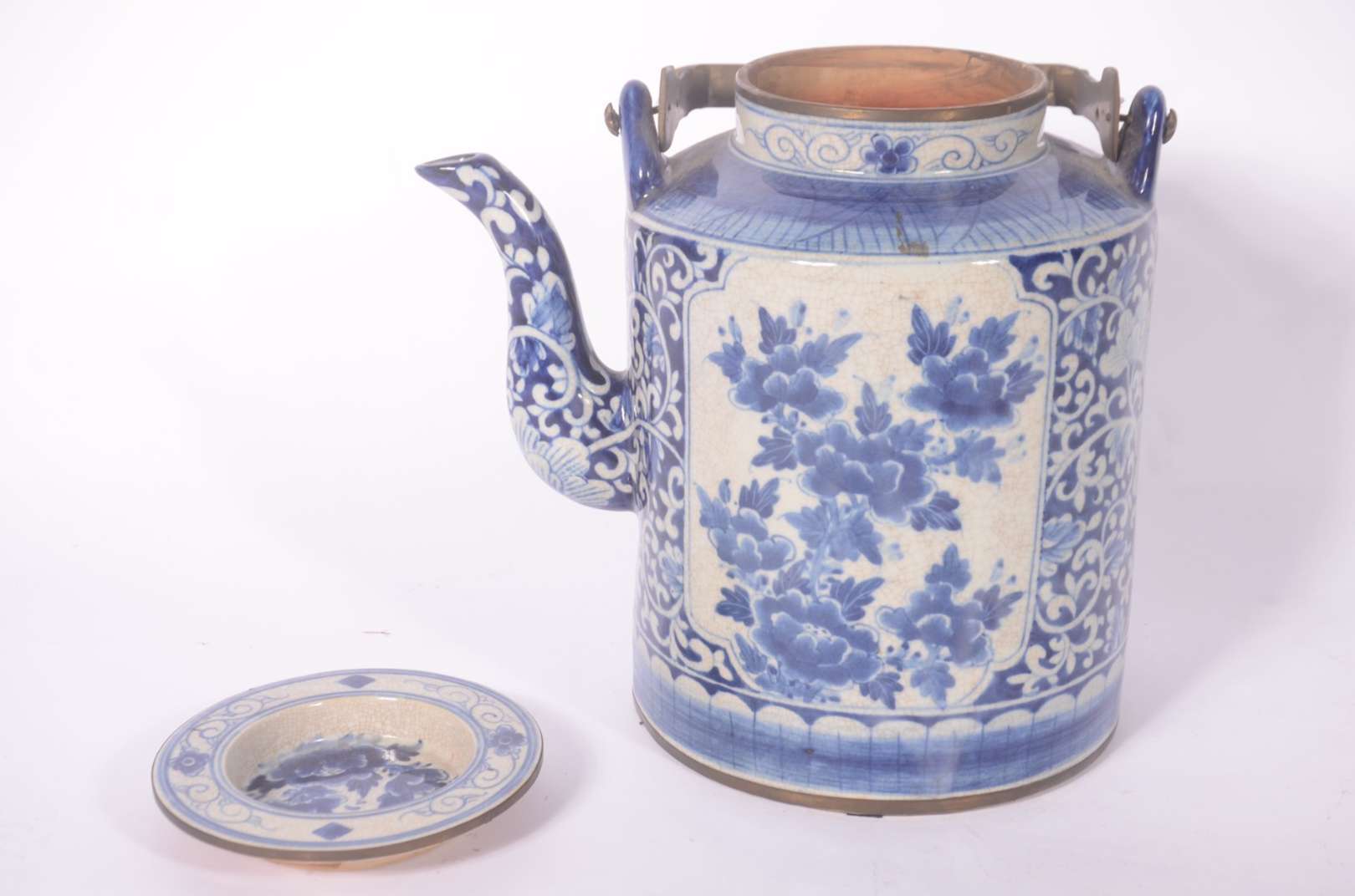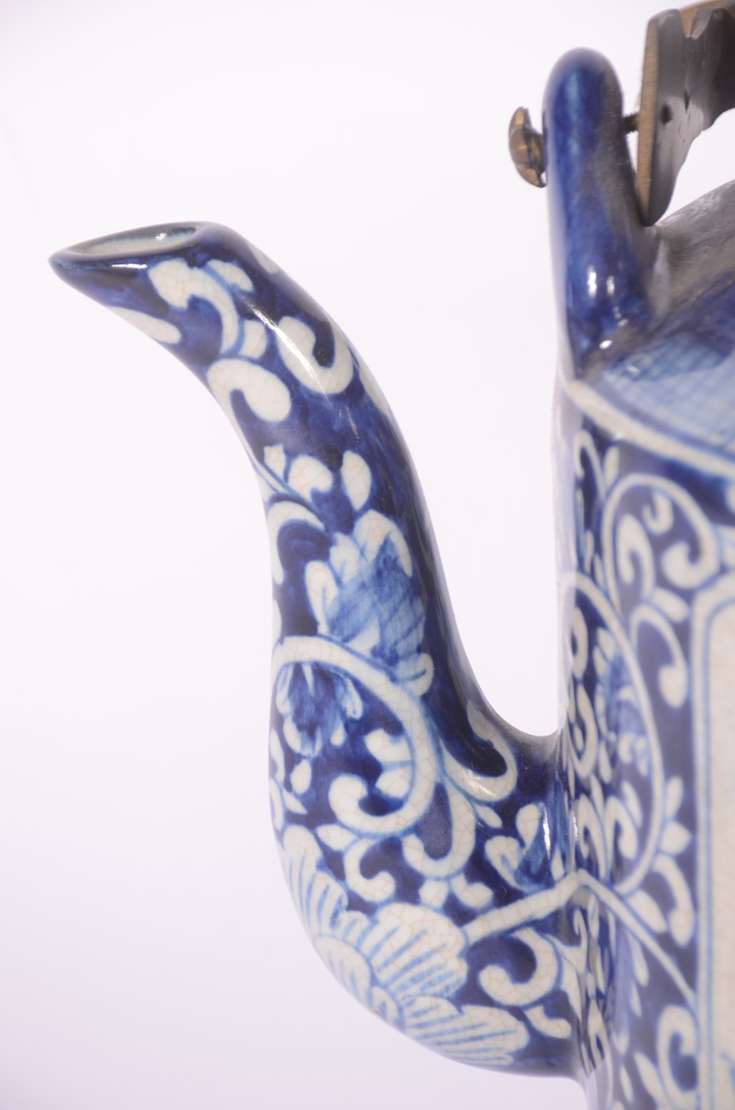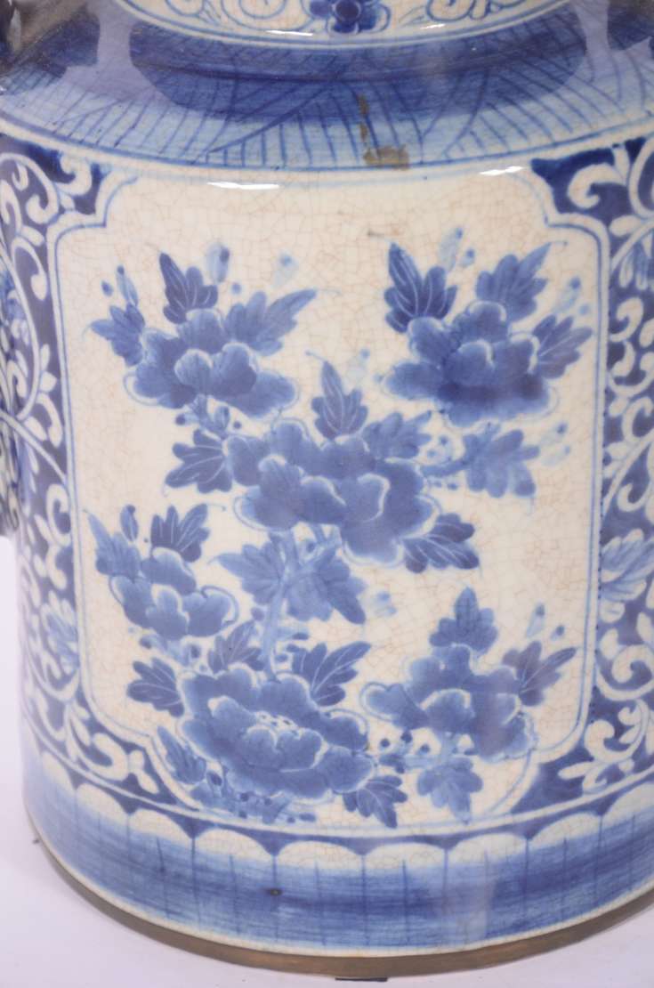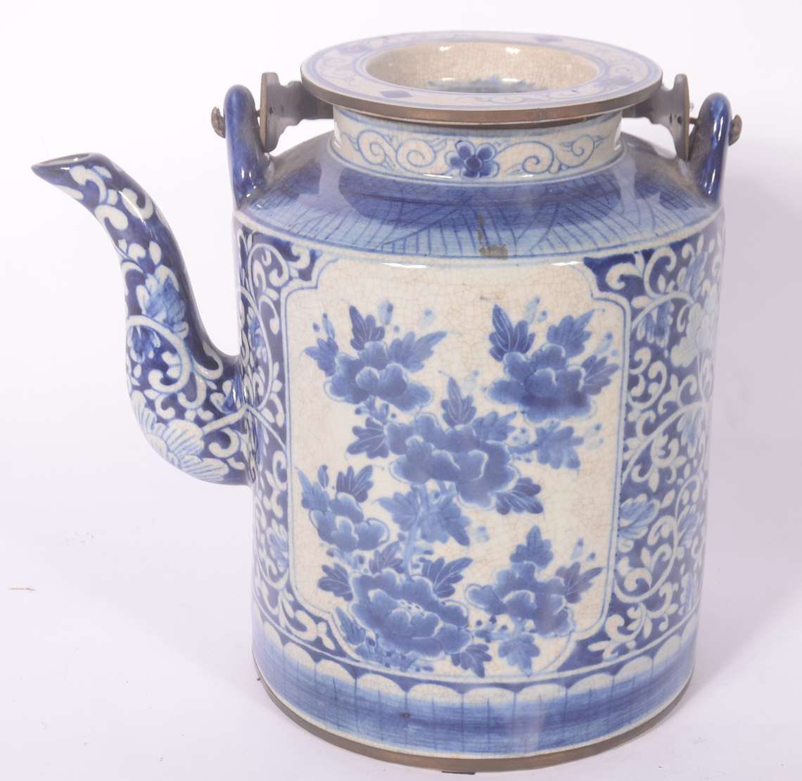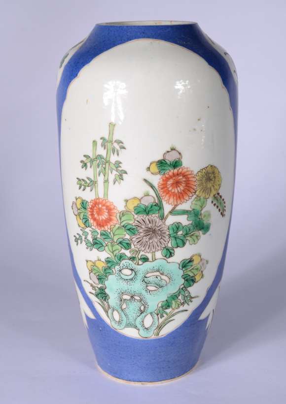 Vaso de porcelana oriental decorado com flores em policromia sobre faixas azuis. Assinado na base.