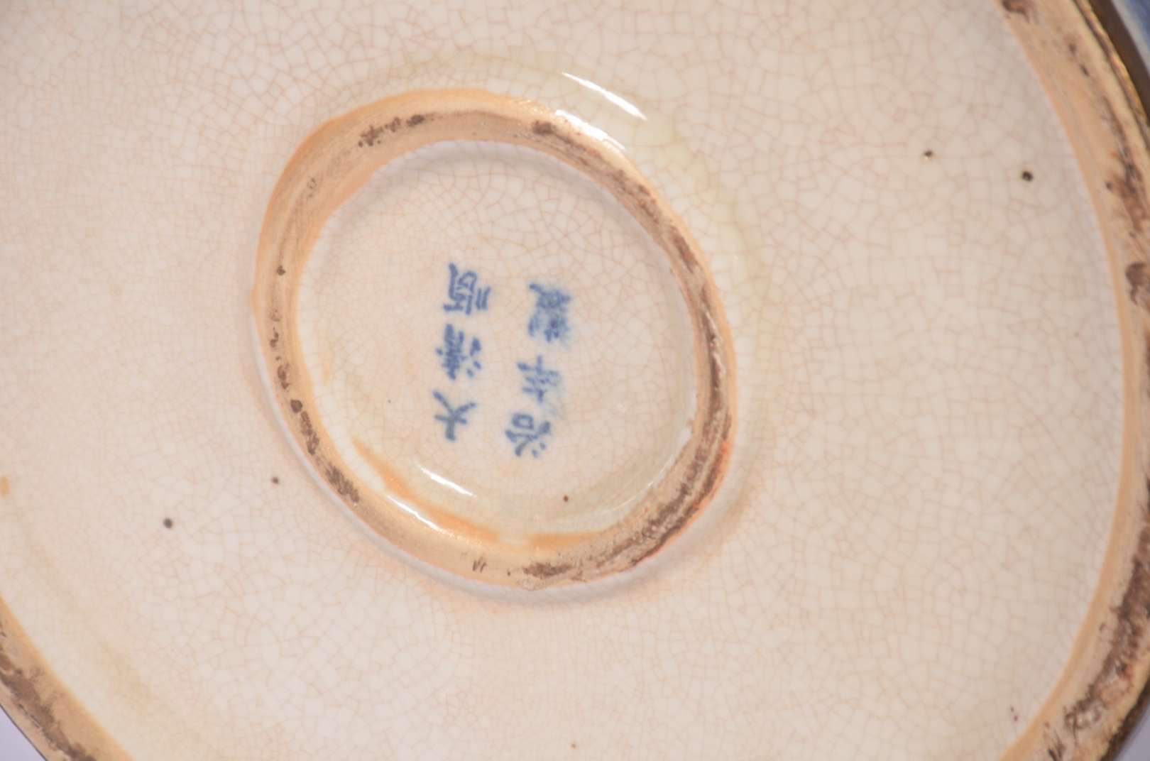 Vaso de faiança oriental decorado com figura de gueixa e flores em policromia, borda ondulada. Base de madeira.