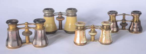 Quatro binóculos para teatro de diversos modelos e procedências. Desgastes.