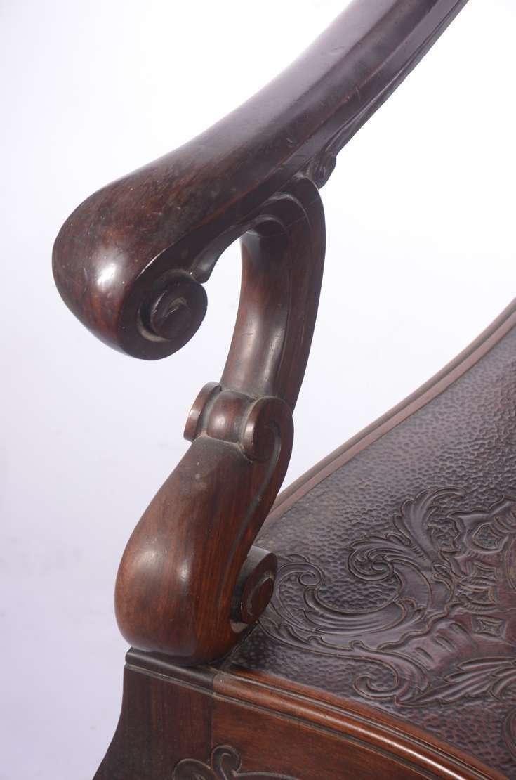 Cadeira de balanço de madeira nobre, braços apoiados em pequenas colunas torneadas, estofamento forrado de curvim pre...