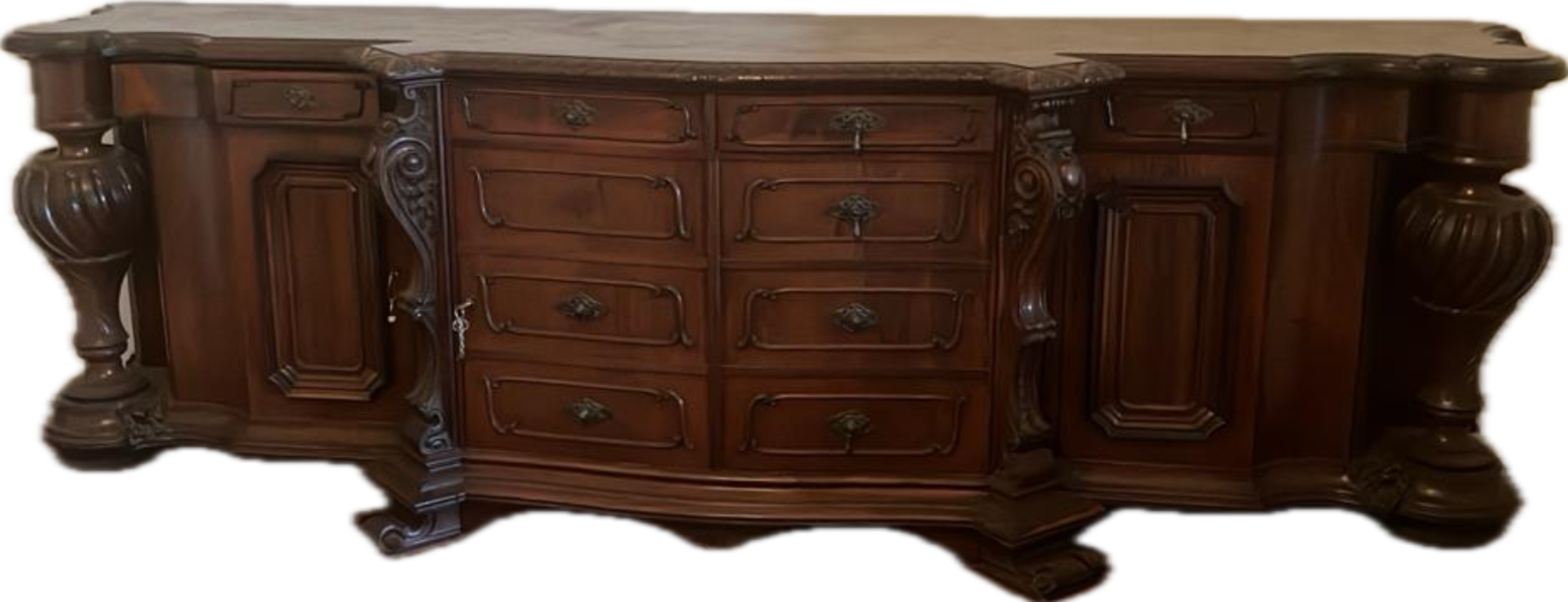 Móvel faqueiro de madeira nobre com faqueiro tailandês de metal dourado com cabo de madeira, composto de: 12 colhere...