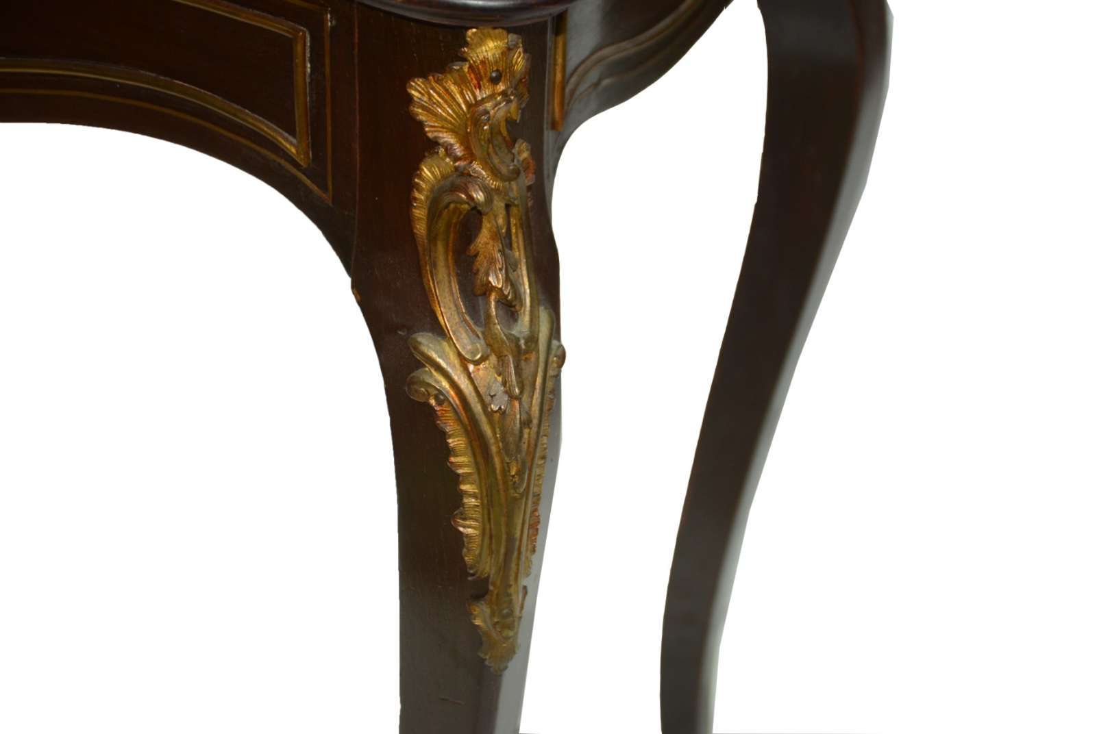 Mesa rústica de madeira nobre com duas gavetas, pernas retas.