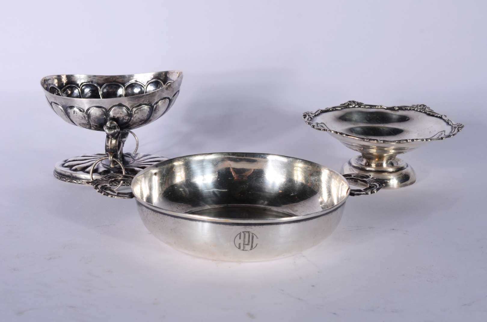 Três pequenas peças de prata de lei, sendo: duas cestas, uma contraste Sterling e outra inglesa; e, bowl com monogram...
