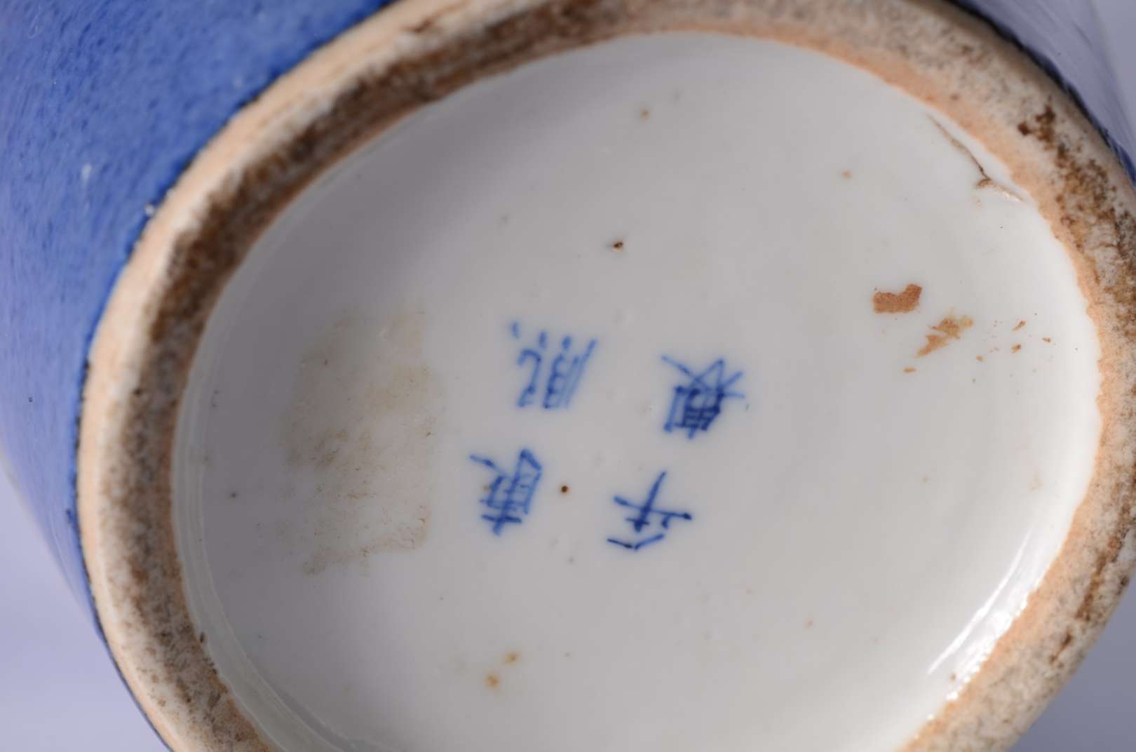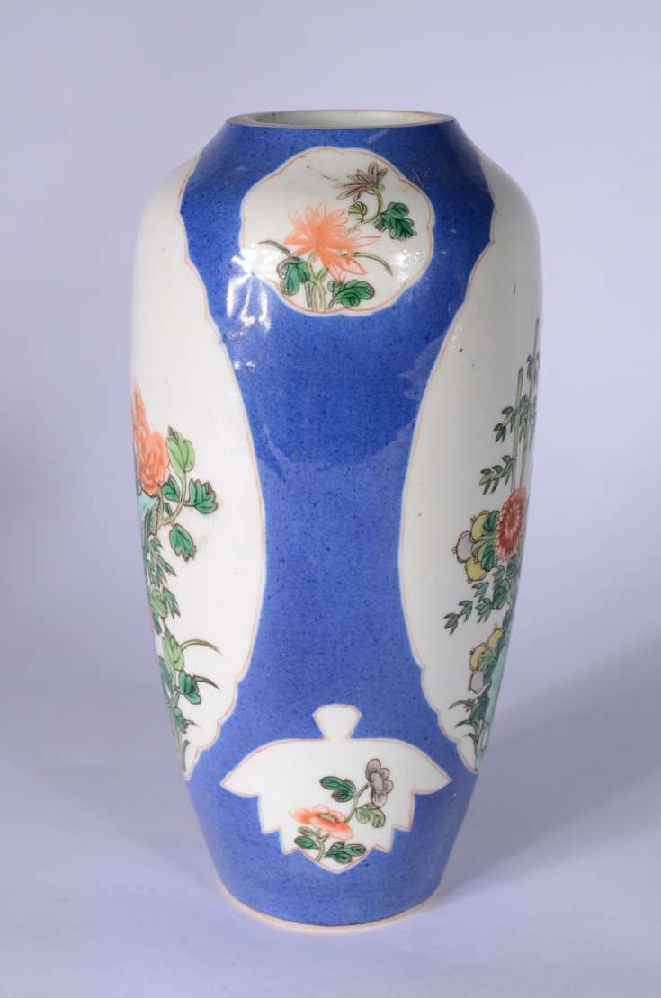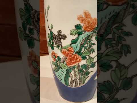 Vaso de porcelana oriental decorado com flores em policromia sobre faixas azuis. Assinado na base.