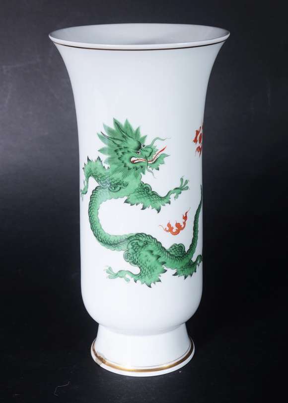 Vaso de porcelana alemã de Meissen, decoração oriental com figura de dragão em policromia. Pequeno lascado na base.