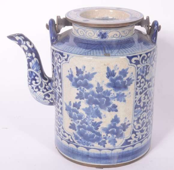 Grande chaleira decorativa de porcelana oriental em tons de azul e branco.