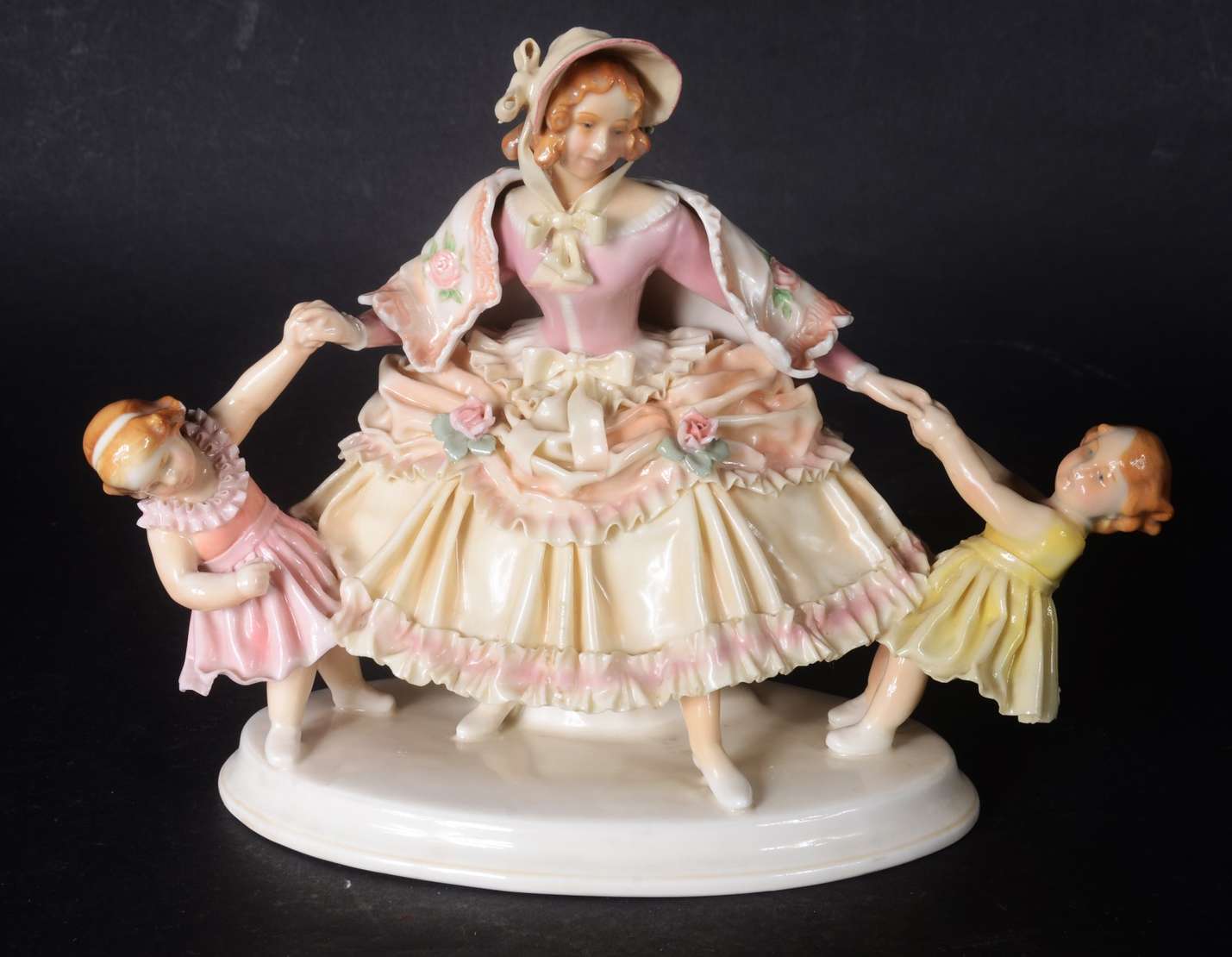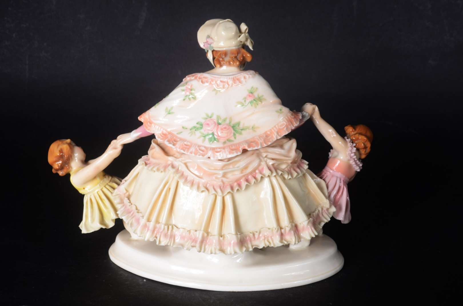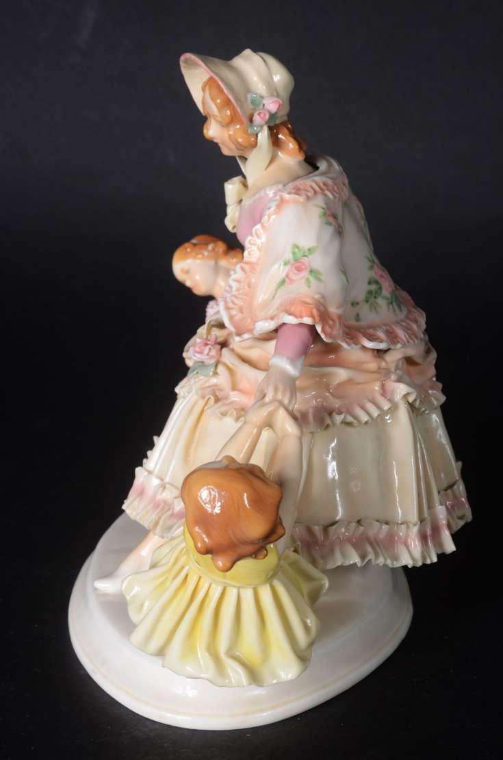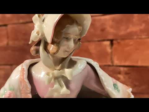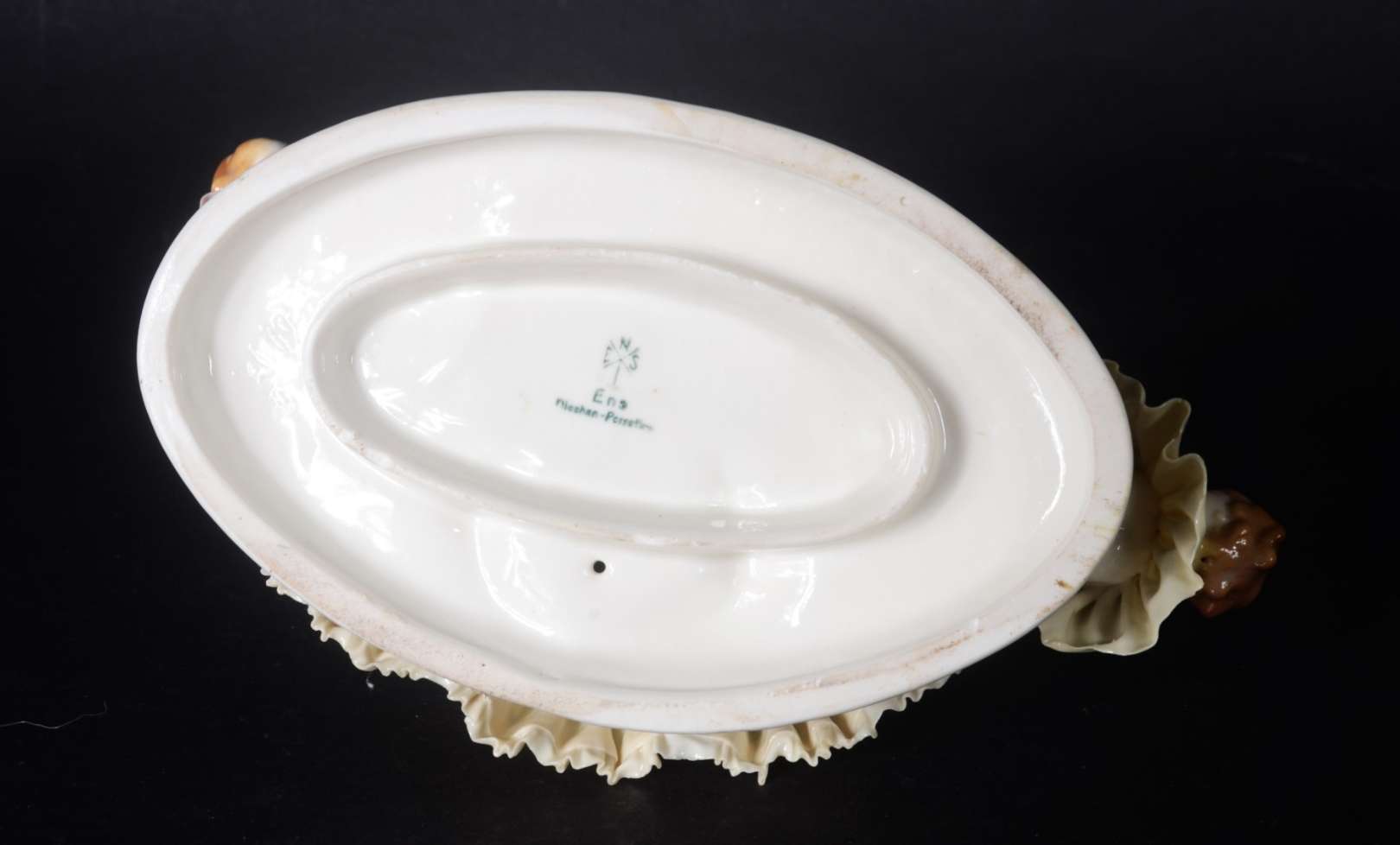 Estatueta de porcelana espanhola "NAO" representando casal com pato e cachorro.
