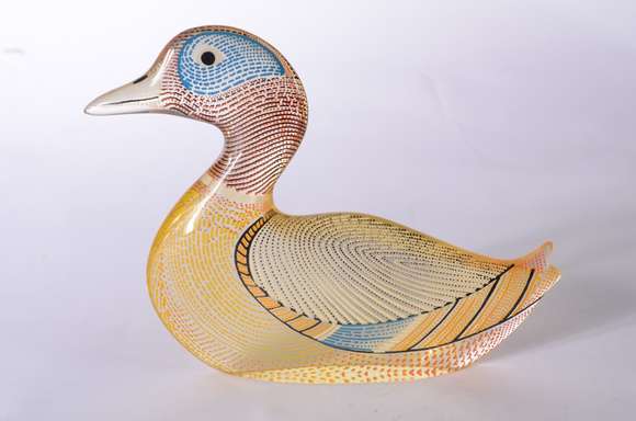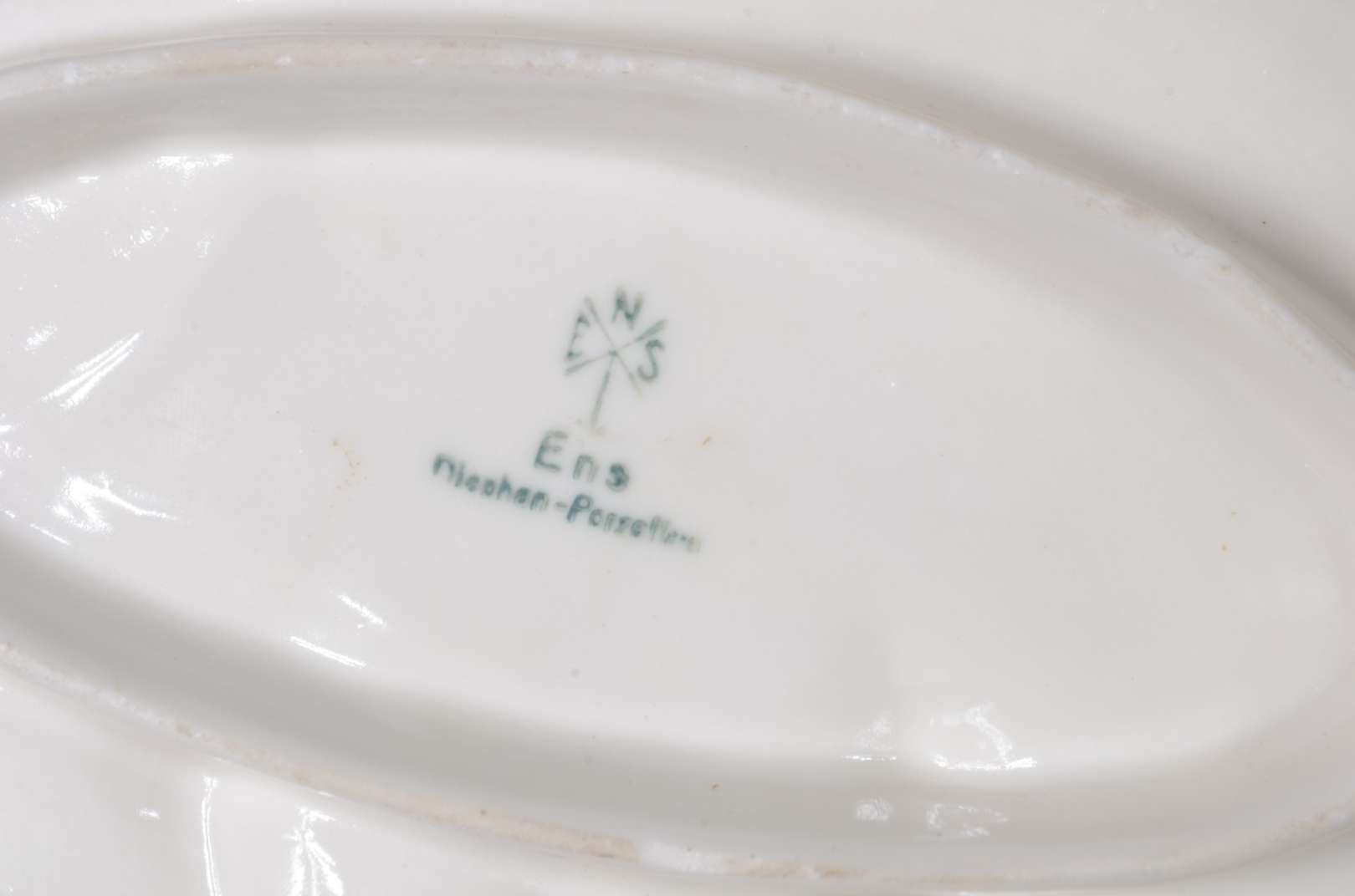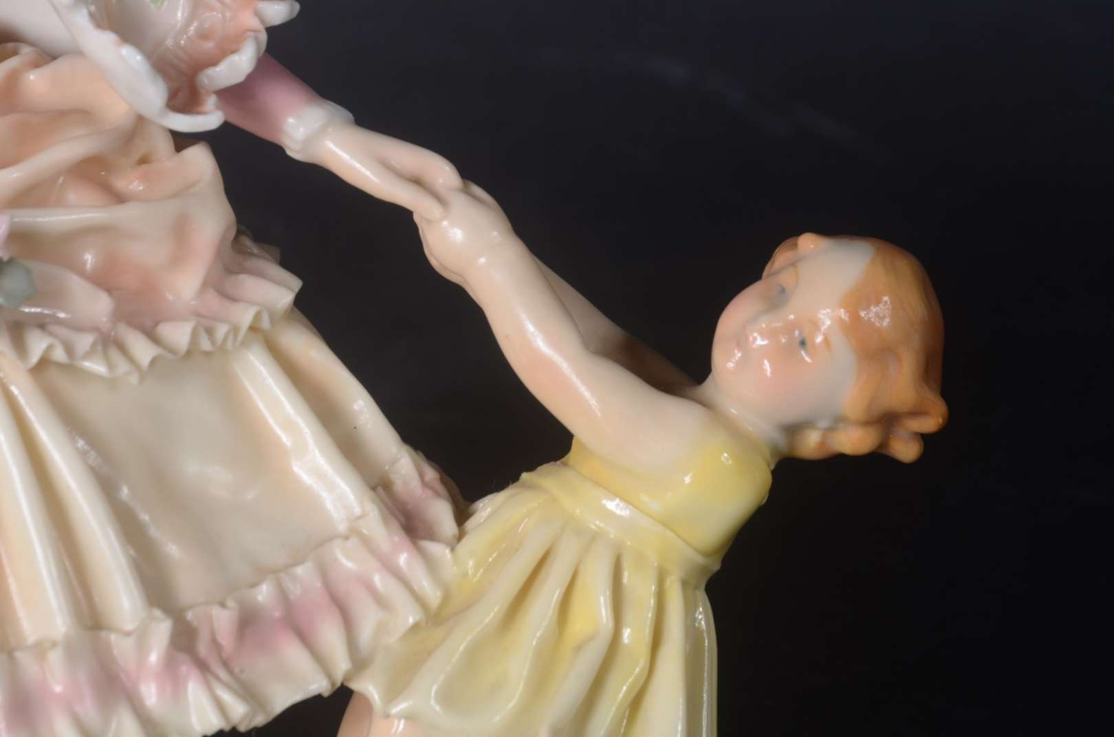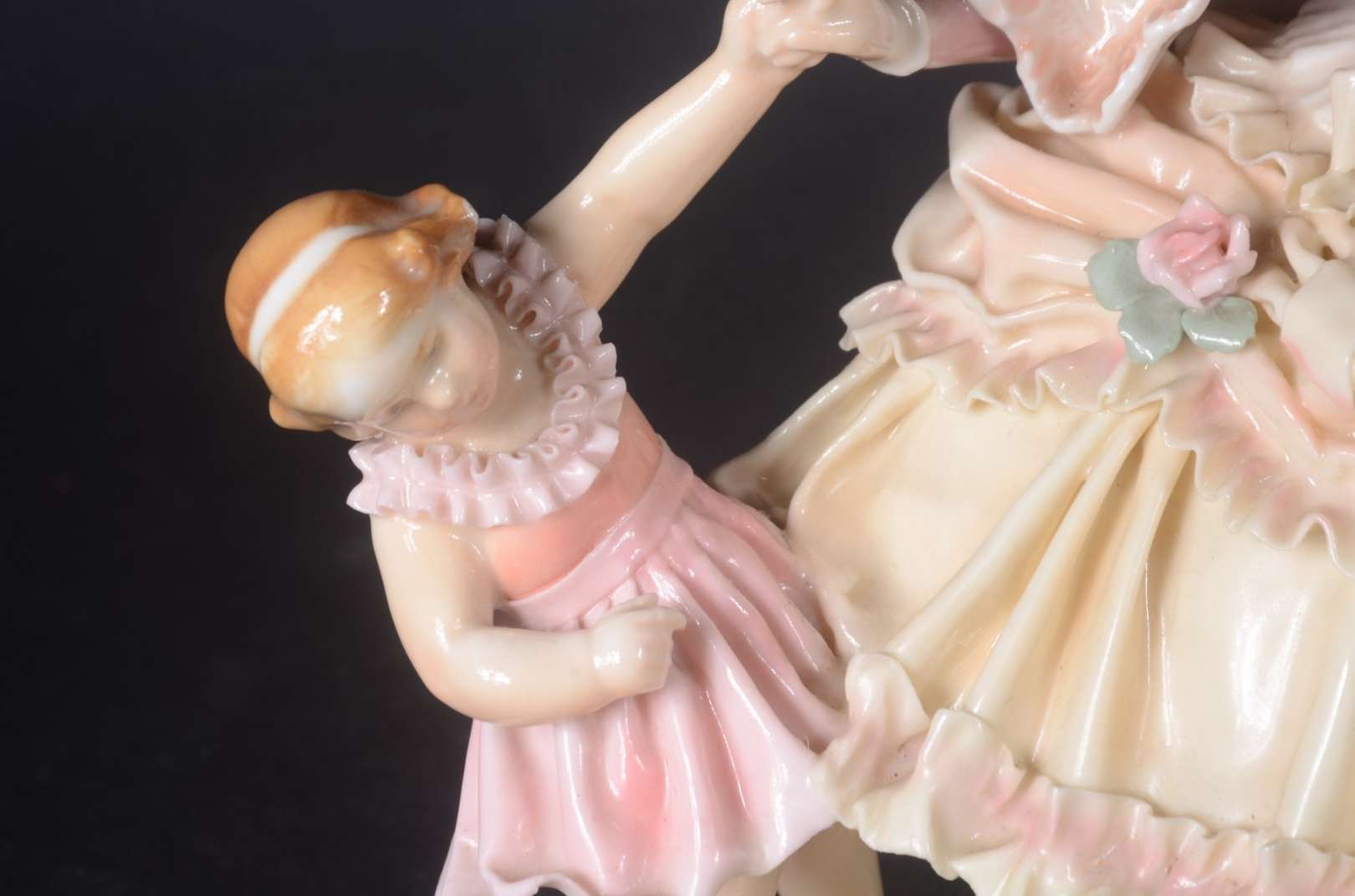 Estatueta de porcelana espanhola "NAO" representando casal com pato e cachorro.