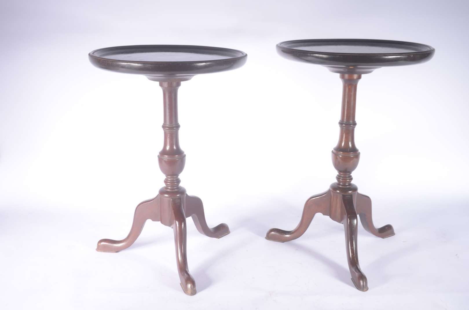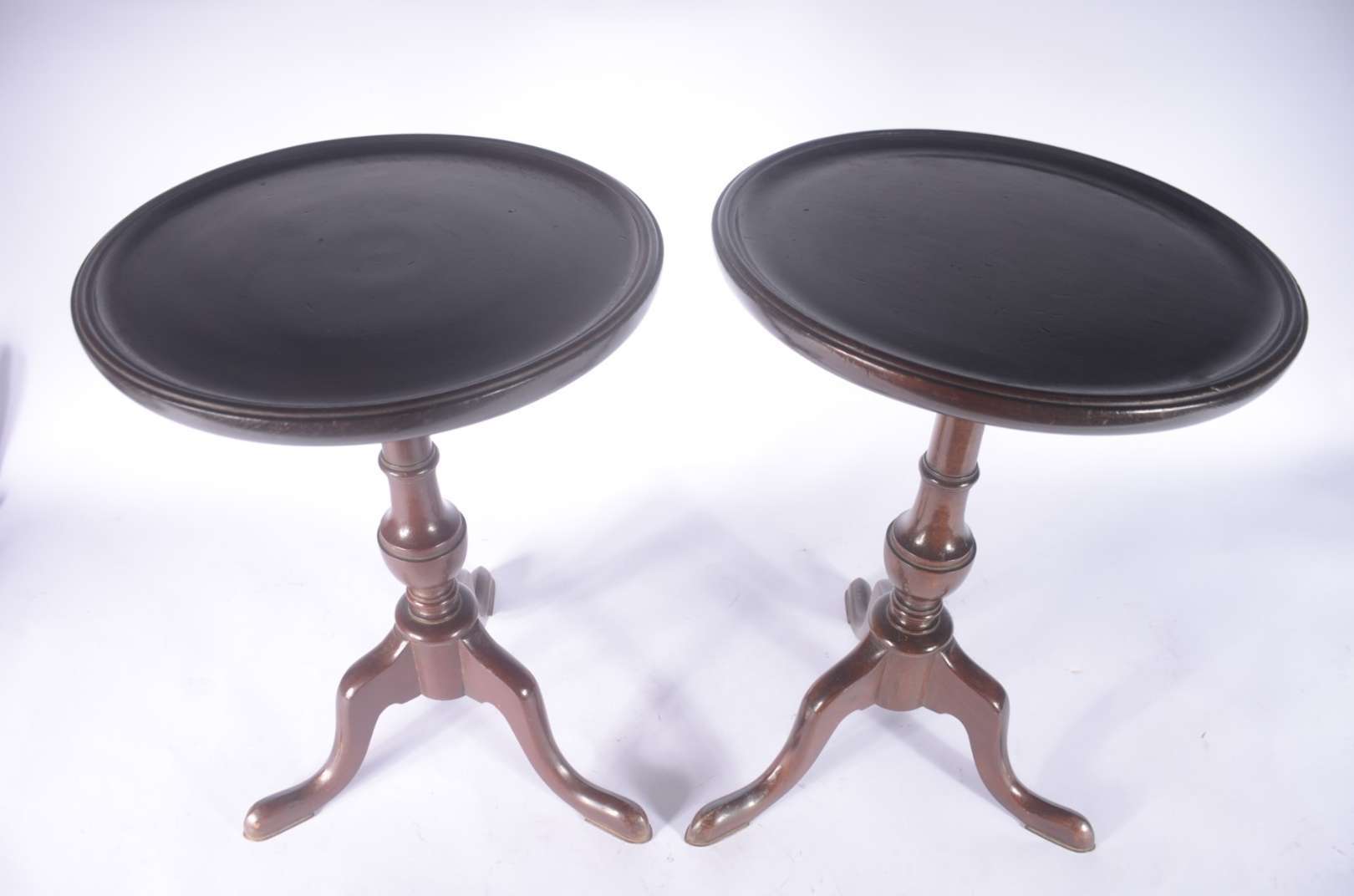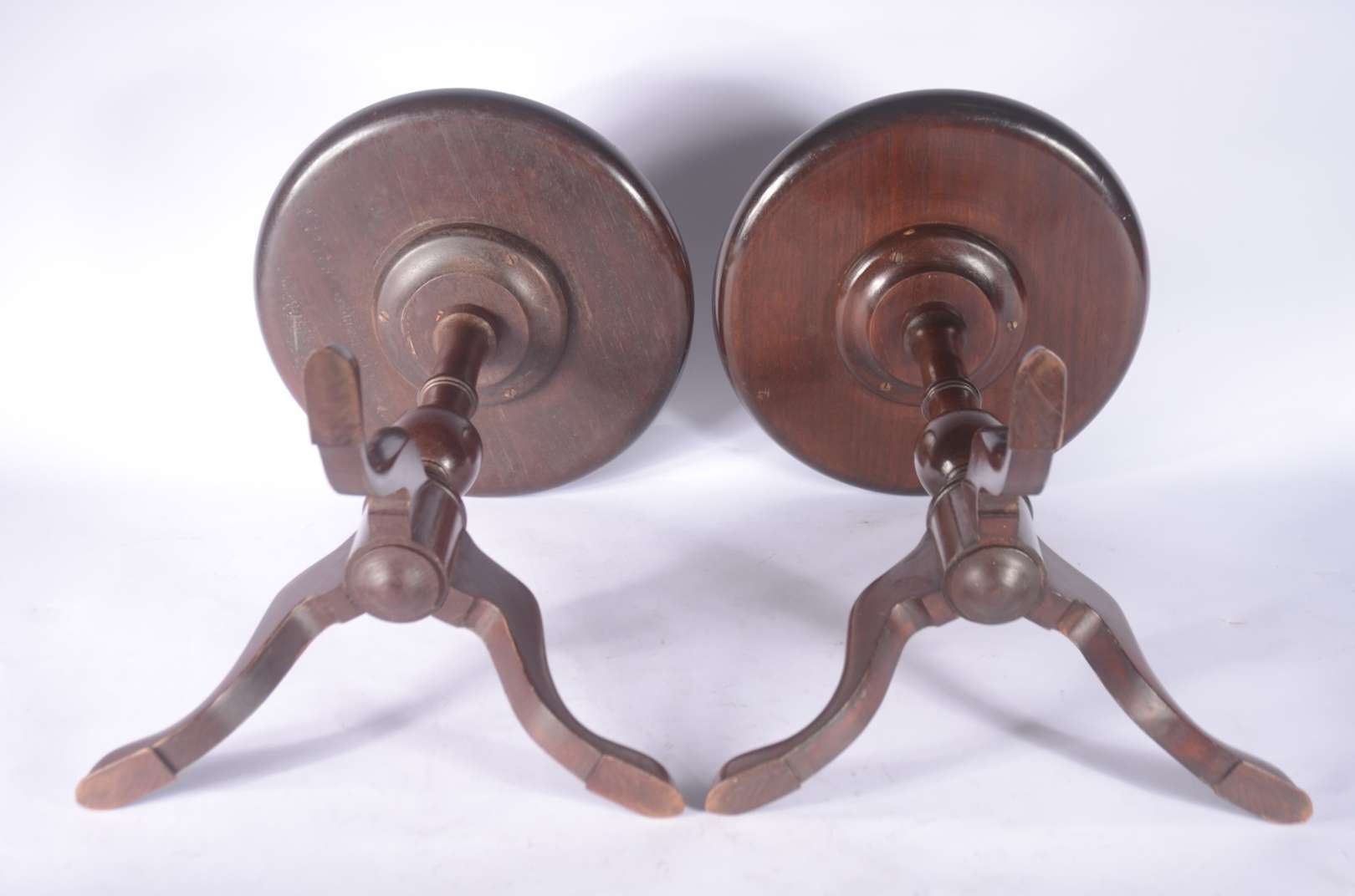 Duas mesas de bar em madeira com pés de metal e tampos de mármore. Uma delas com o mármore lascado na quina.