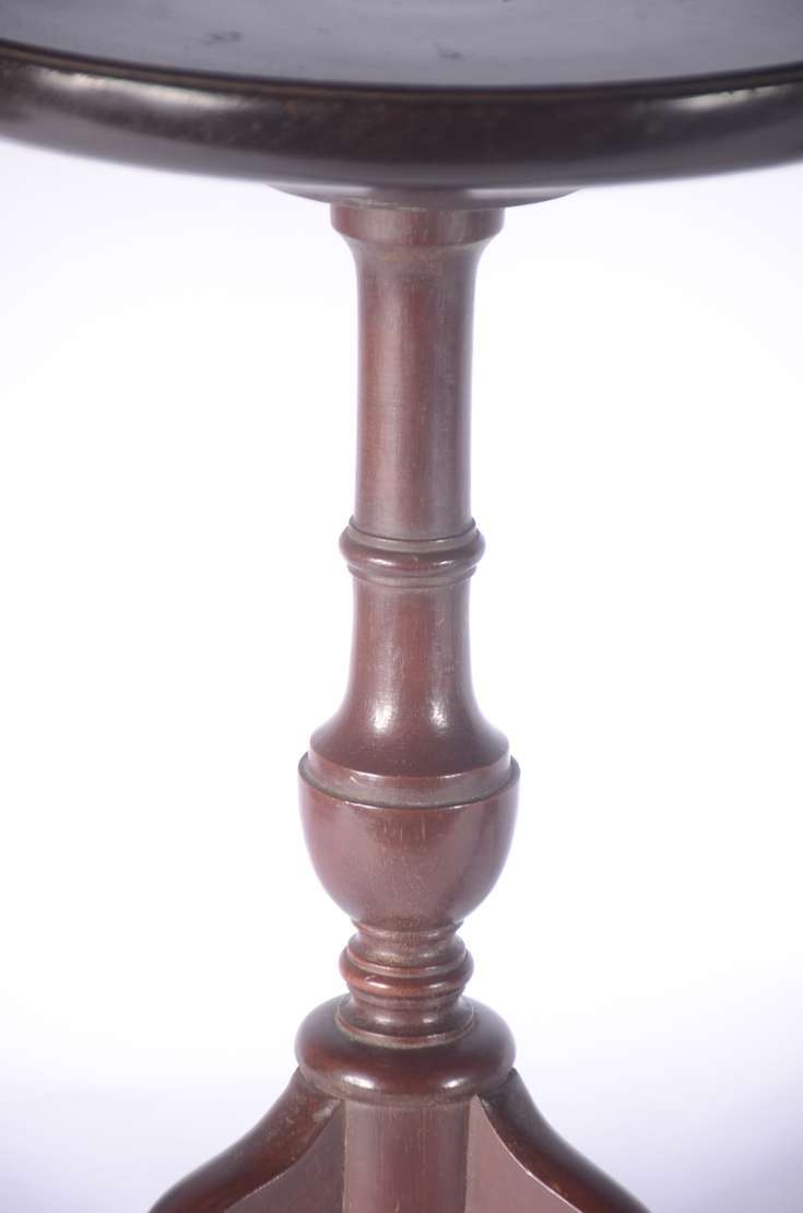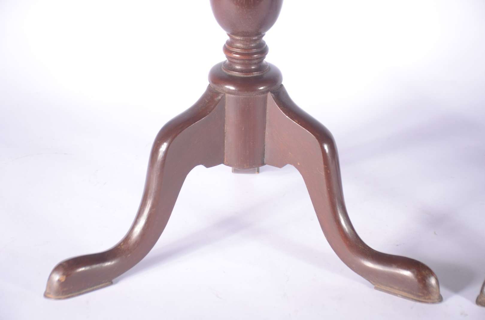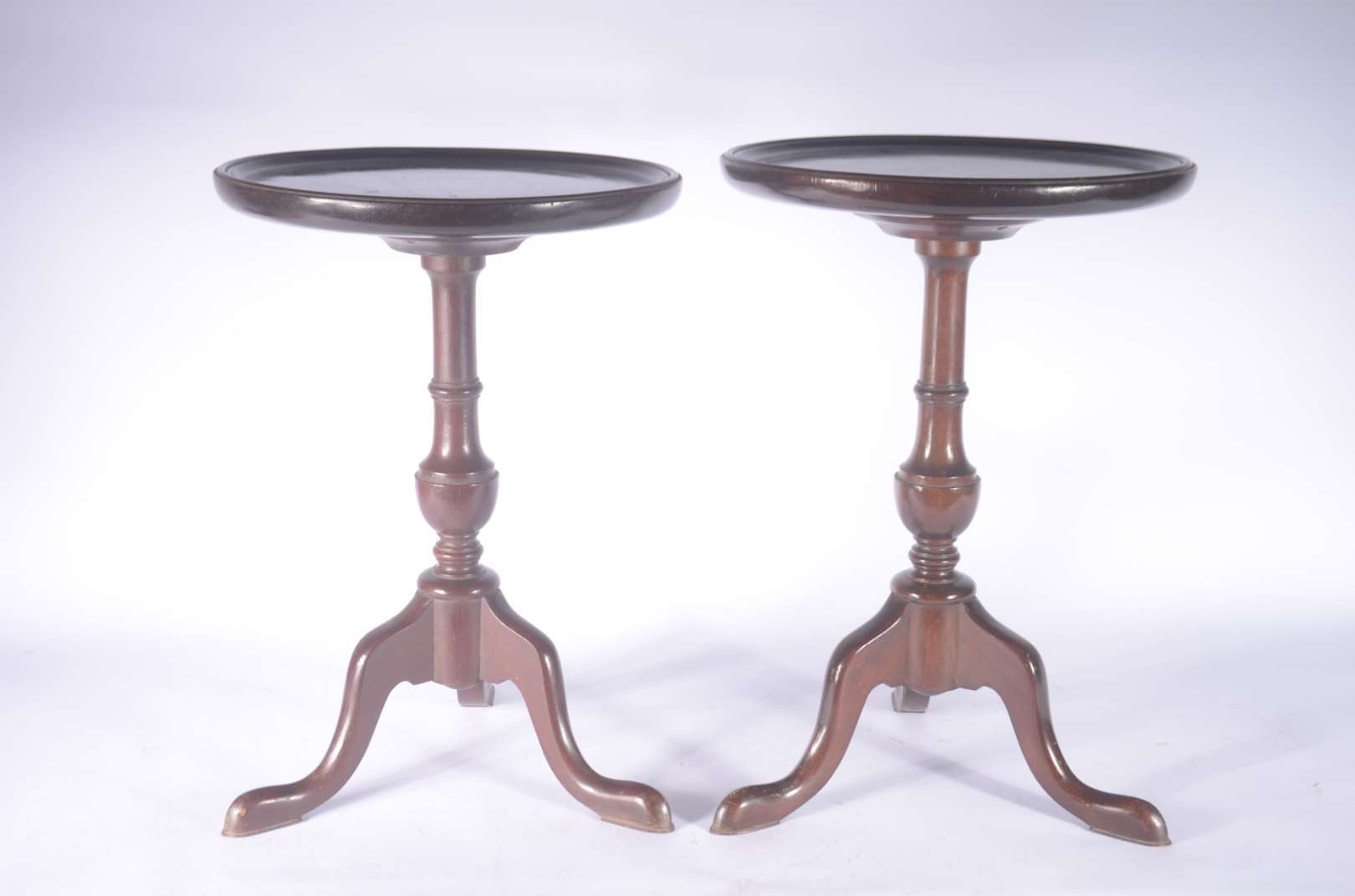 Duas mesas de bar em madeira com pés de metal e tampos de mármore. Uma delas com o mármore lascado na quina.
