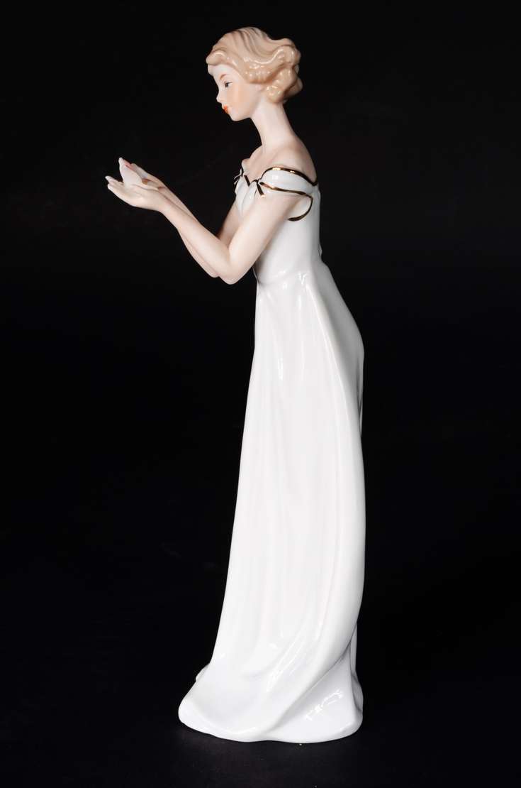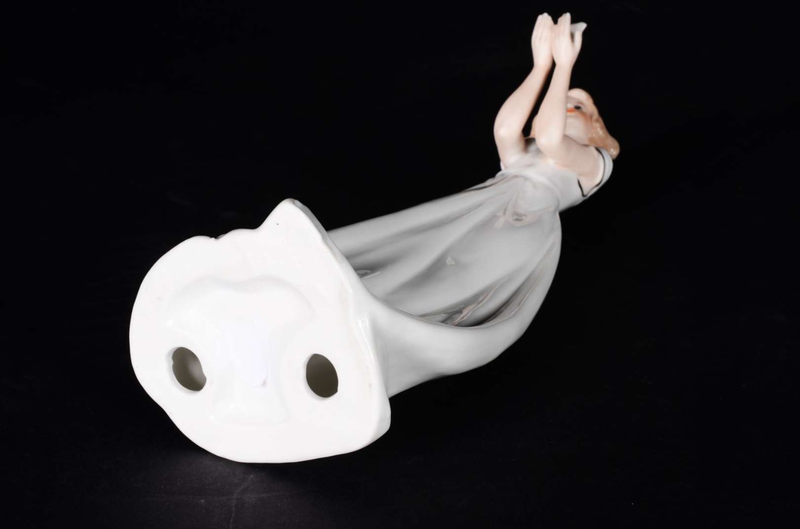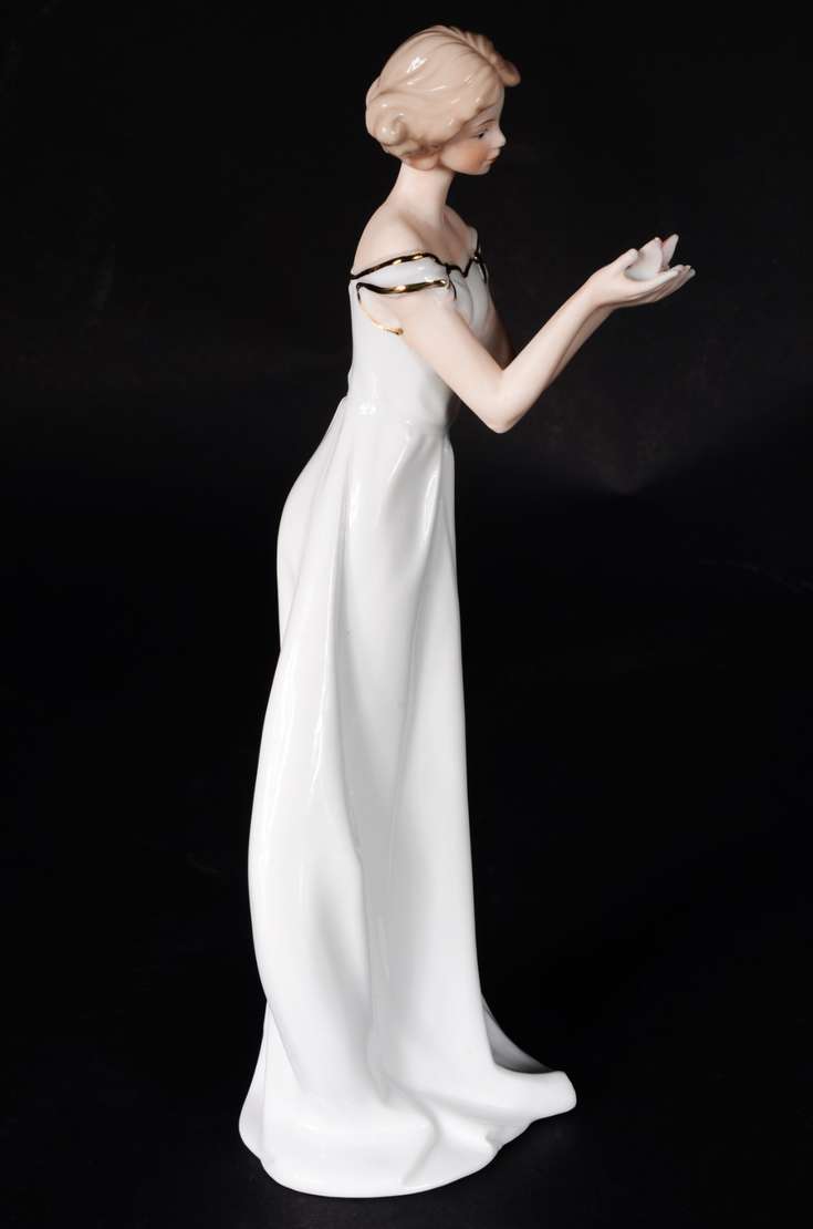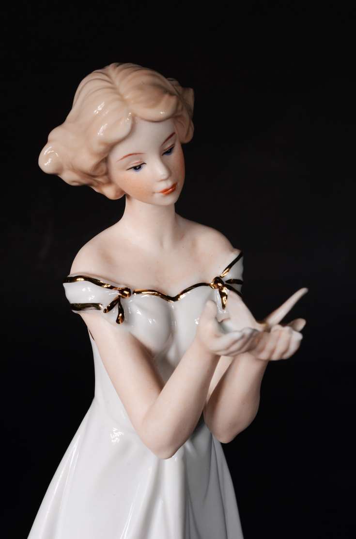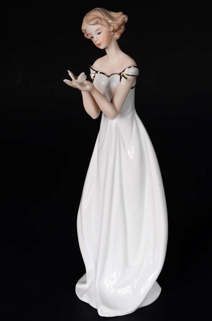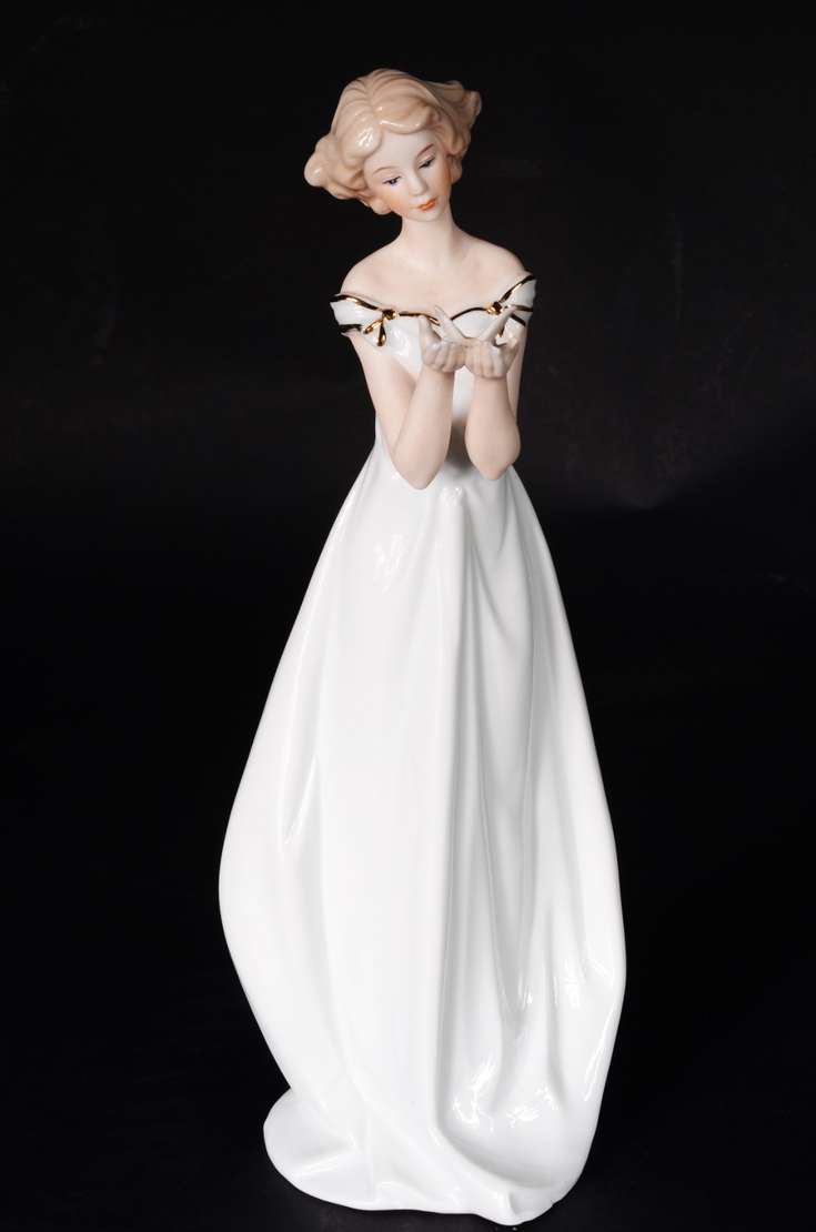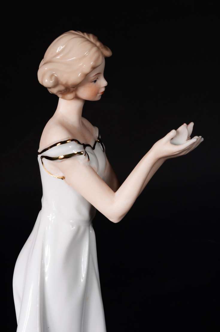 Estatueta de porcelana espanhola "NAO" representando menina com pássaros. Asas coladas.