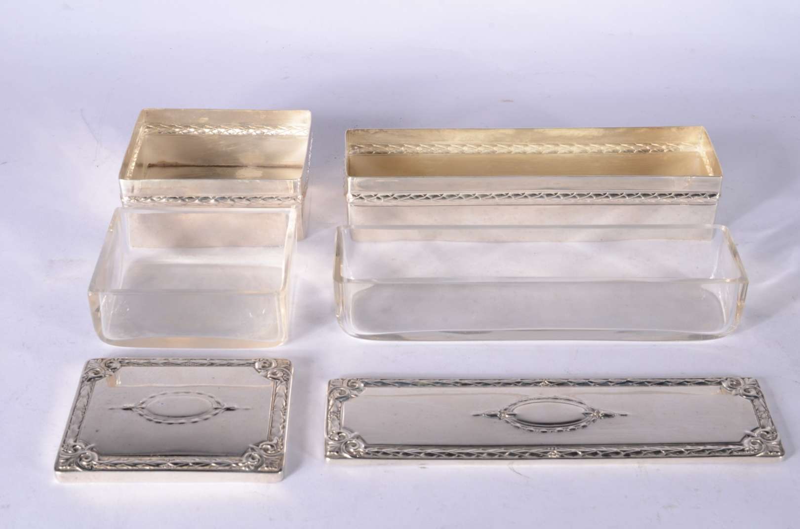 Quatro fracos diversos de cristal, sendo dois perfumeiros opalinados (um sem a tampa e o outro com a tampa quebrada),...