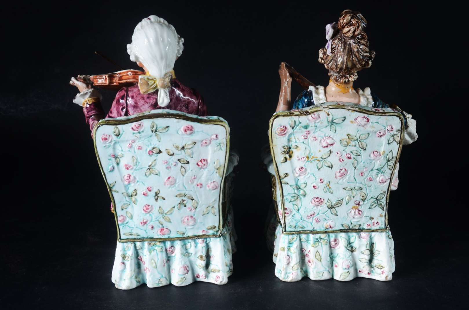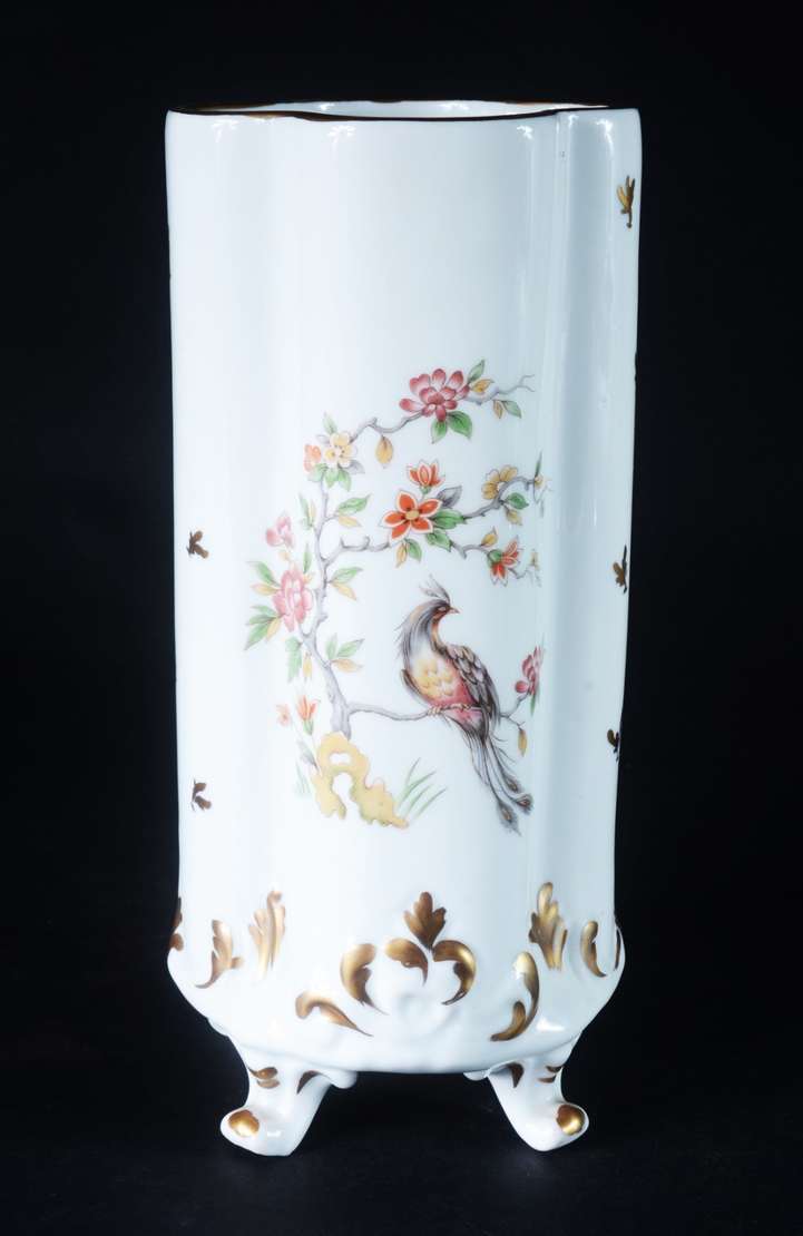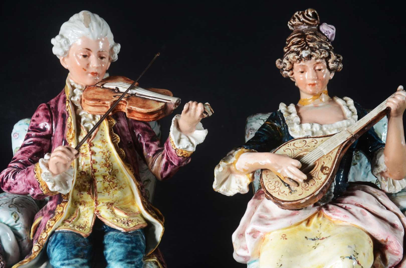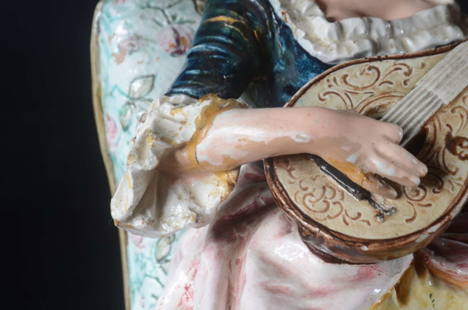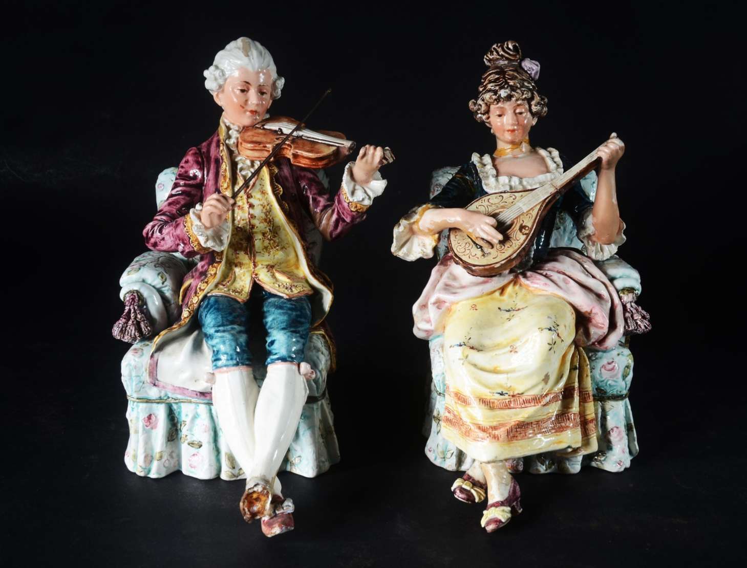 Tres peças diversas, sendo: Par de estatuetas de cerâmica policromada representando casal de musicistas (partes faltantes e colados) e, vaso oriental decorado com ave paraíso.