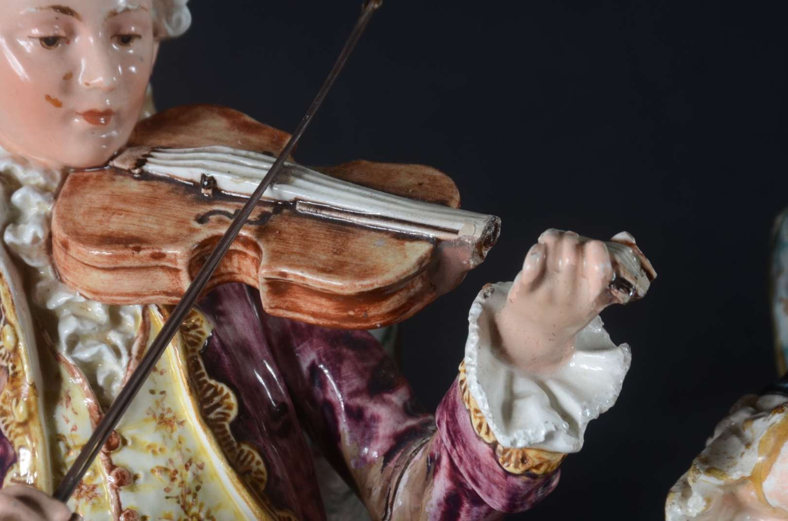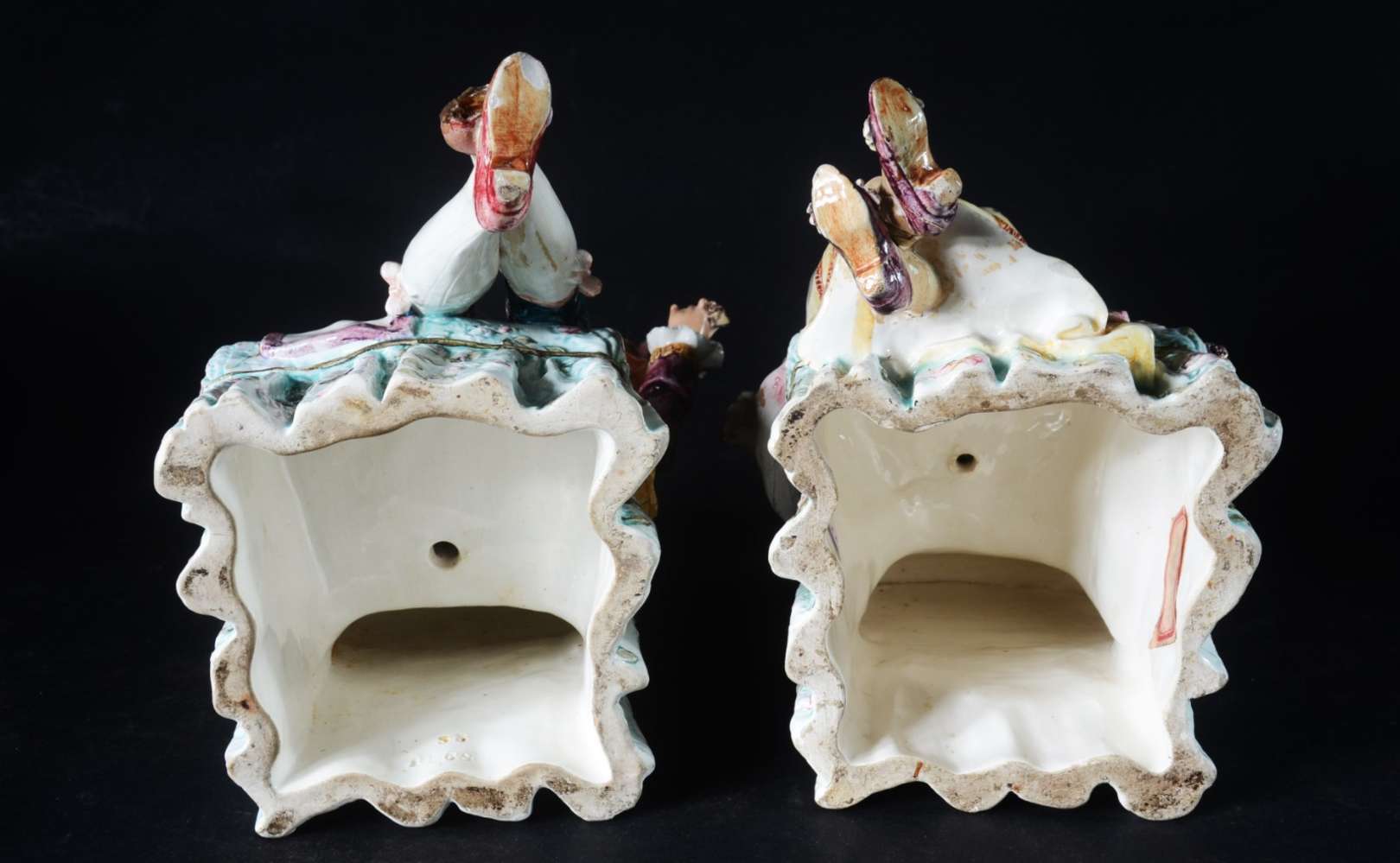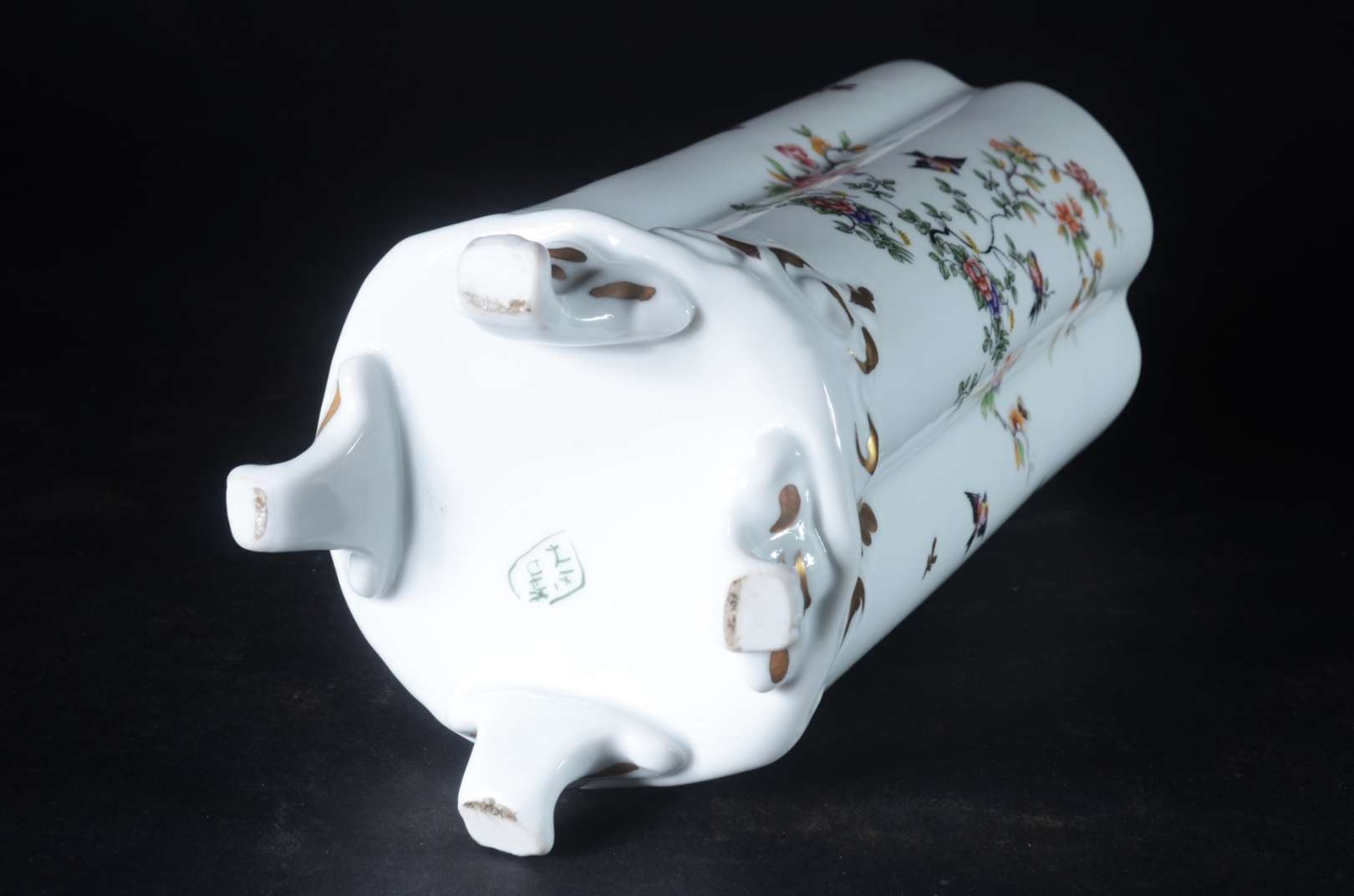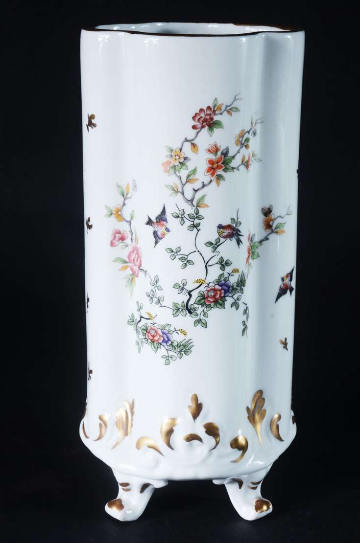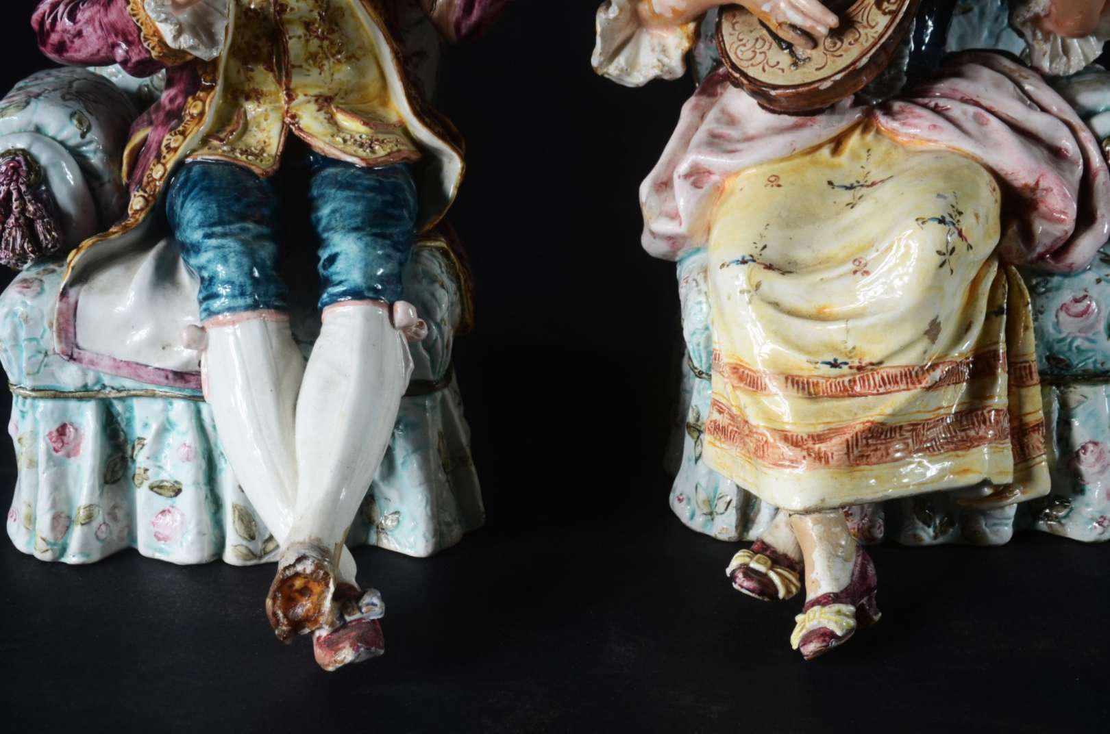 Tres peças diversas, sendo: Par de estatuetas de cerâmica policromada representando casal de musicistas (partes faltantes e colados) e, vaso oriental decorado com ave paraíso.
