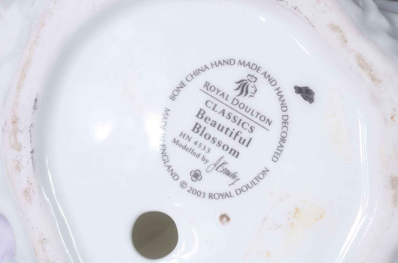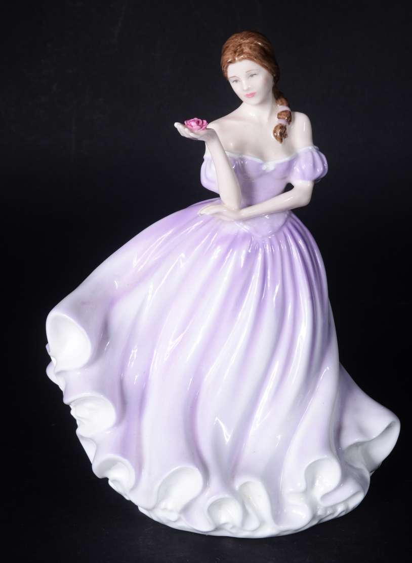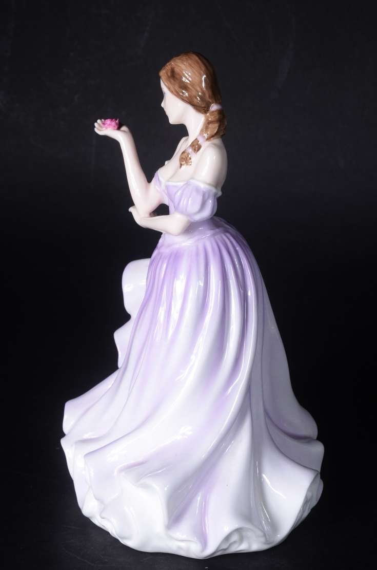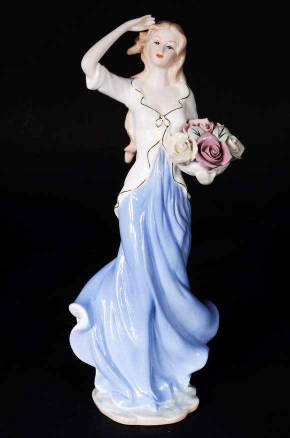 Estatueta de porcelana representando dama com cesto de flores.