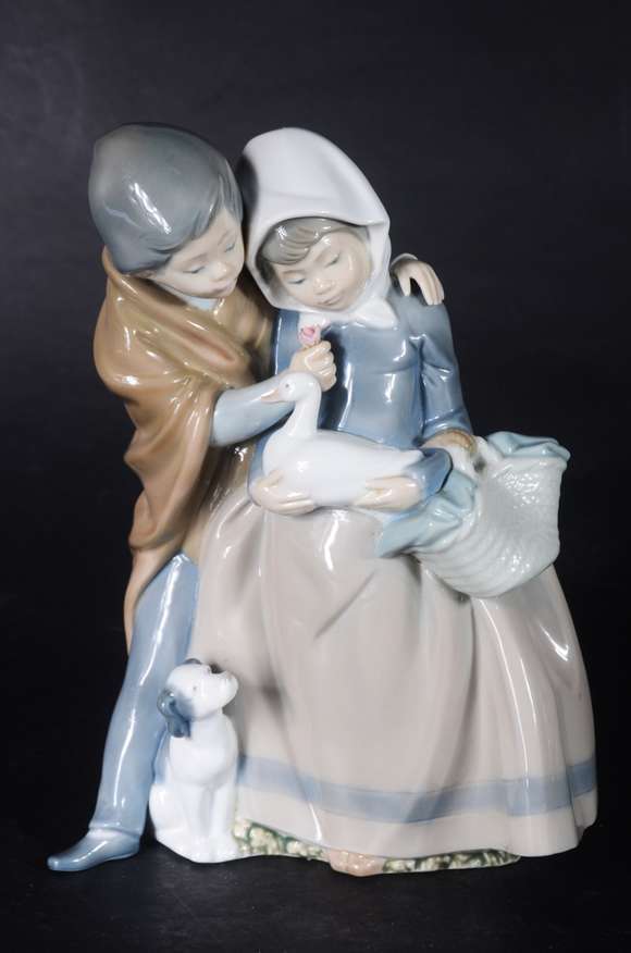 Estatueta de porcelana espanhola "NAO" representando casal com pato e cachorro.