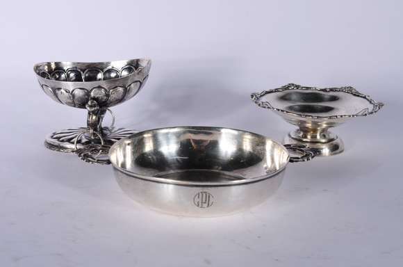 Três pequenas peças de prata de lei, sendo: duas cestas, uma contraste Sterling e outra inglesa; e, bowl com monogram...