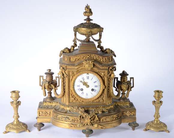 Garniture de bronze francês composto de relógio e par de castiçais. Relógio ricamente decorado com pequenas ânforas l...