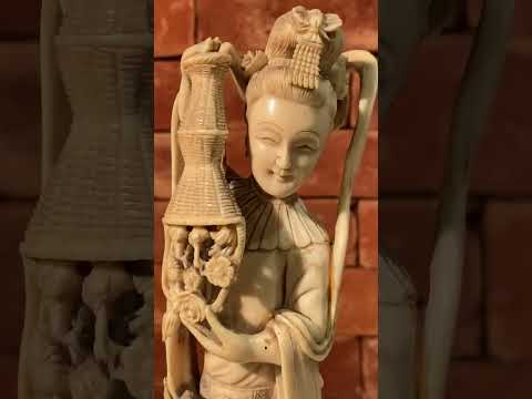 Escultura de marfim representando pescador e criança. Faltando um braço e alguns colados.