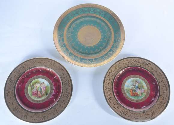 Três pratos de porcelana alemã da Bavaria, dois deles decorados com ninfas em policromia, realces dourados. Desgastes...