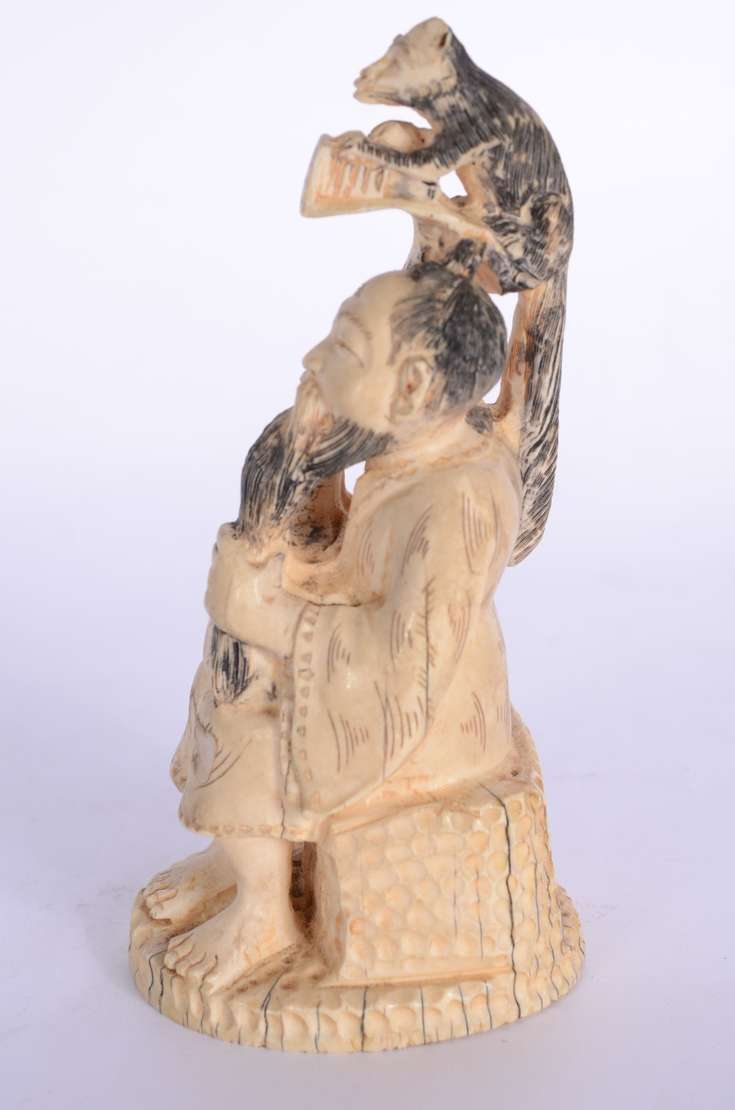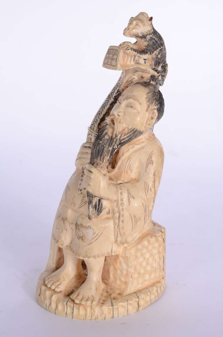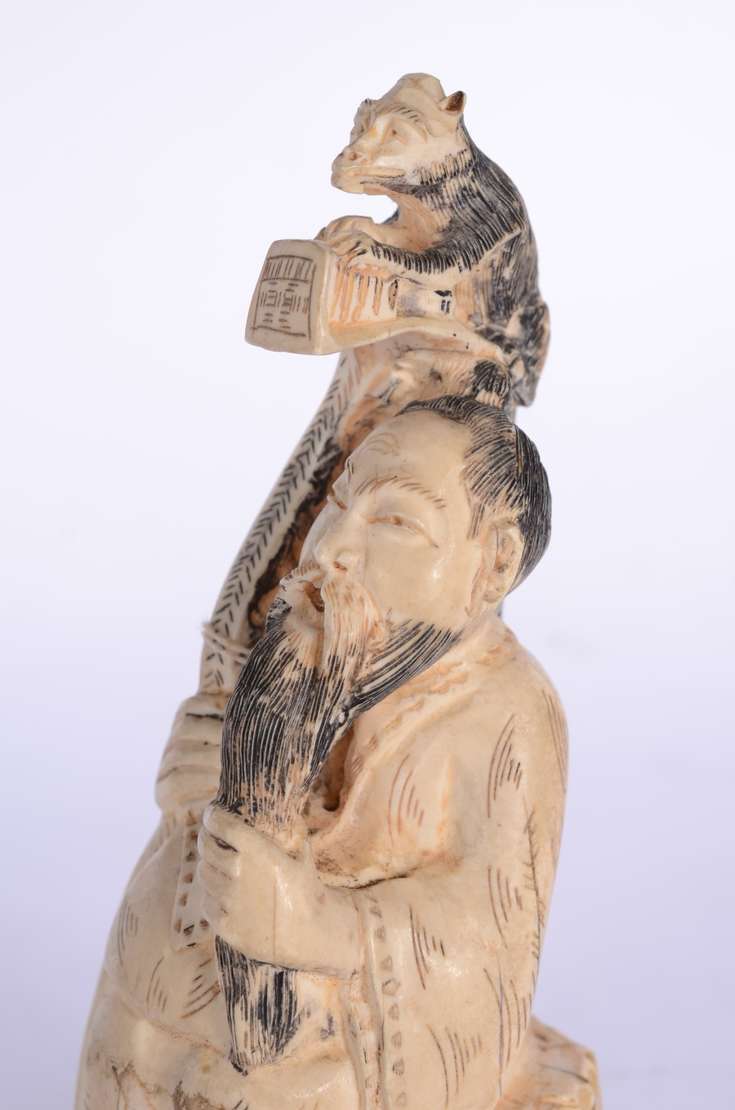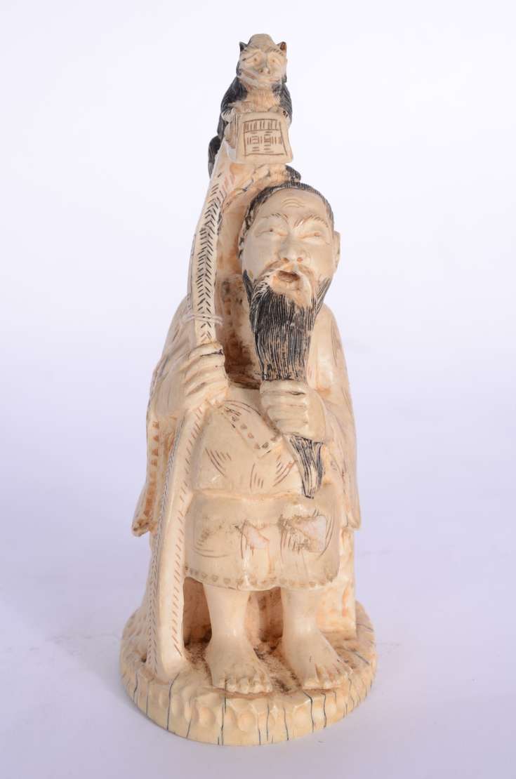 Escultura chinesa em marfim representando Caishen, o Deus chinês da riqueza, segurando lingote de prata e moeda em se...