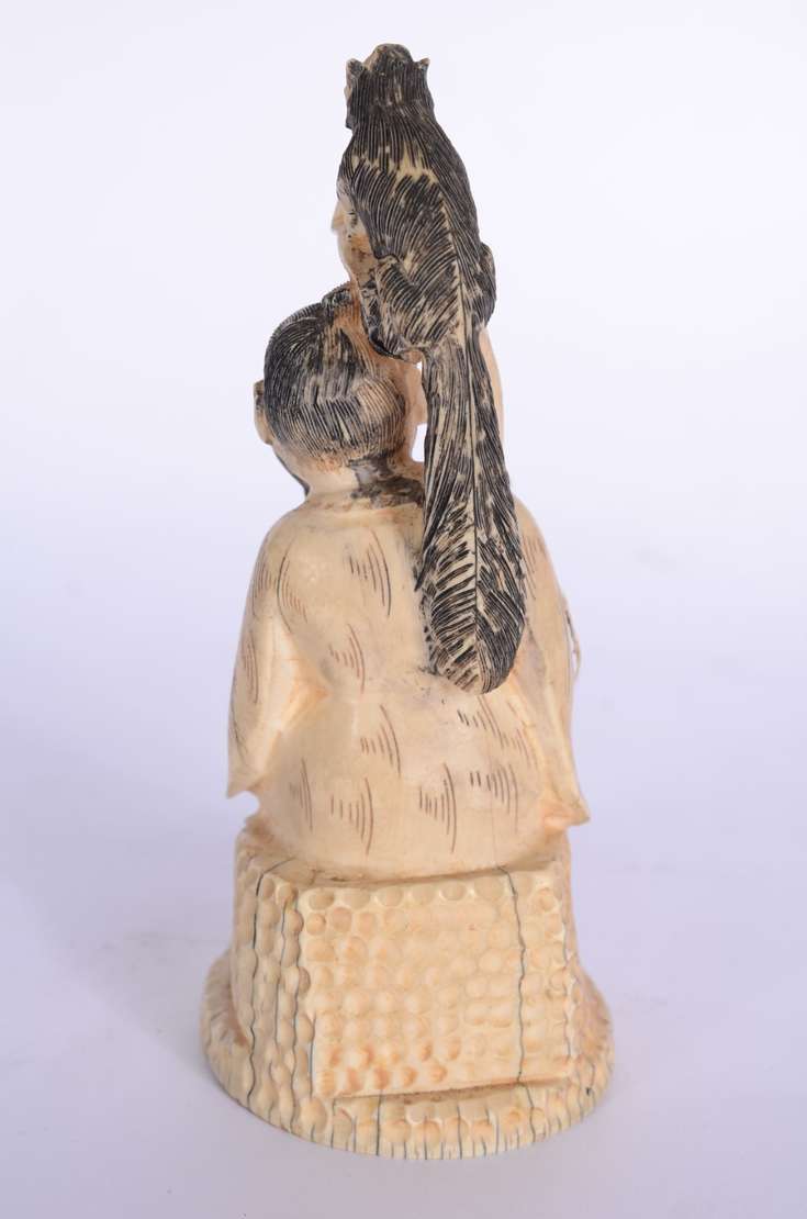 Escultura de marfim representando gueixa com flores, base de madeira. Altura total: 33 cm.